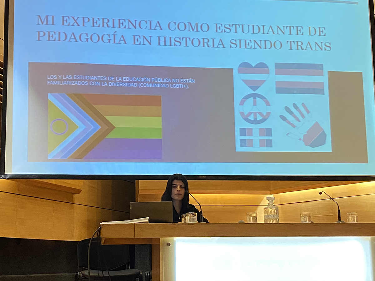 Posteriormente, la profesora de la Escuela Básica Palestina de La Calera, Martina Gaete Minolleti, contó lo difícil que es para las personas trans impartir clases a escolares. “Yo siento que soy la única, pero estoy contenta de ejercer”, agregando que se enfrentan día a día a sesgos, prejuicios y falta de oportunidades laborales y de acompañamiento profesional.
