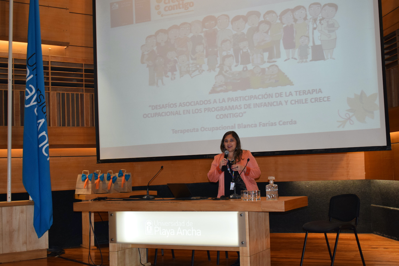 La primera exposición de la jornada la realizó la terapeuta ocupacional Blanca Farías Cerda, ex estudiante UPLA, quien con 12 años de labor profesional en el área infantil, hoy se desempeña como asesora técnica del Programa Nacional de Salud de la Infancia y gerenta (s) en el Programa de apoyo al desarrollo biopsicosocial Chile Crece Contigo. En este contexto, la profesional se refirió justamente a los Desafíos asociados a la participación de la Terapia Ocupacional en este programa.