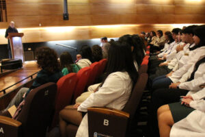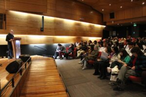 A nombre de la directora de la carrera de Pedagogía en Castellano, Macarena Aguirre Astudillo, quien está con licencia médica, el académico Aldo Espina Ampuero leyó el discurso que tenía preparado para la ocasión.