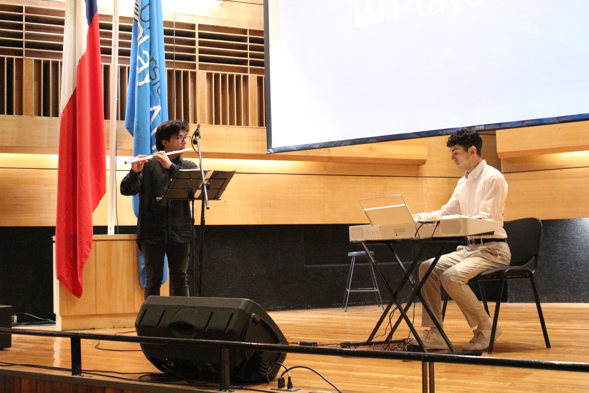 La ceremonia fue amenizada por Bayron Chapa Riquelme y Camilo Espinoza Morales, estudiantes de la carrera de Pedagogía en Educación Musical de la Facultad de Arte, quienes interpretaron las canciones: “Futuri No Kimochi”, “Everything I Wanted”, “El Romerito de tu Patio” y “La Fiesta de San Benito”.