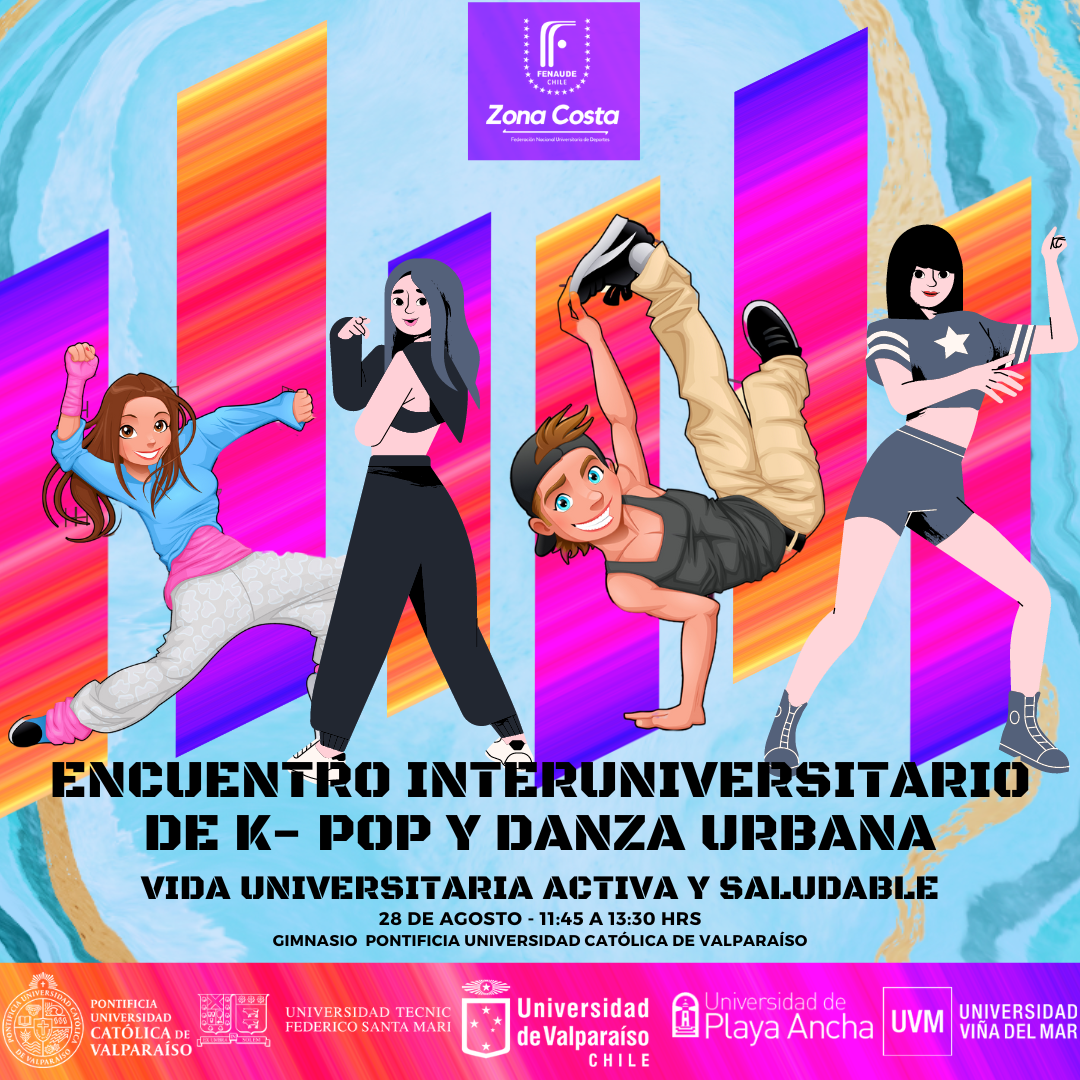 La Dirección de Deportes y Recreación dependiente de la Dirección General de Desarrollo Estudiantil y la Federación Nacional Universitaria de Deportes Zona Costa, (FENAUDE Zona Costa), invita a la comunidad UPLA a participar del primer Encuentro Interuniversitario de K-POP y Danza Urbana, a realizarse el miércoles 28 de agosto, desde las 11:45 horas en el gimnasio de la Pontificia Universidad Católica de Valparaíso (Av. Brasil N° 2950, Valparaíso).