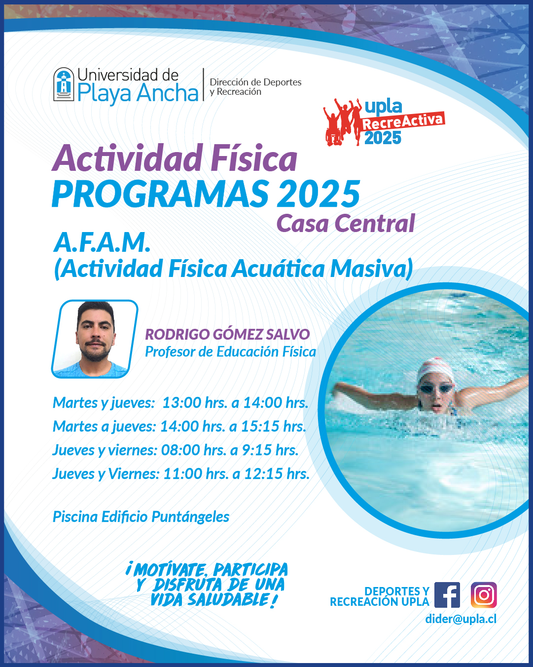 El miércoles 2 de abril comienza una nueva temporada  del programa Actividad Física Acuática Masiva, AFAM, que la Dirección de Deportes y Recreación (DIDER), dependiente de la Dirección General de Desarrollo Estudiantil, desarrolla en Casa Central para la comunidad UPLA.