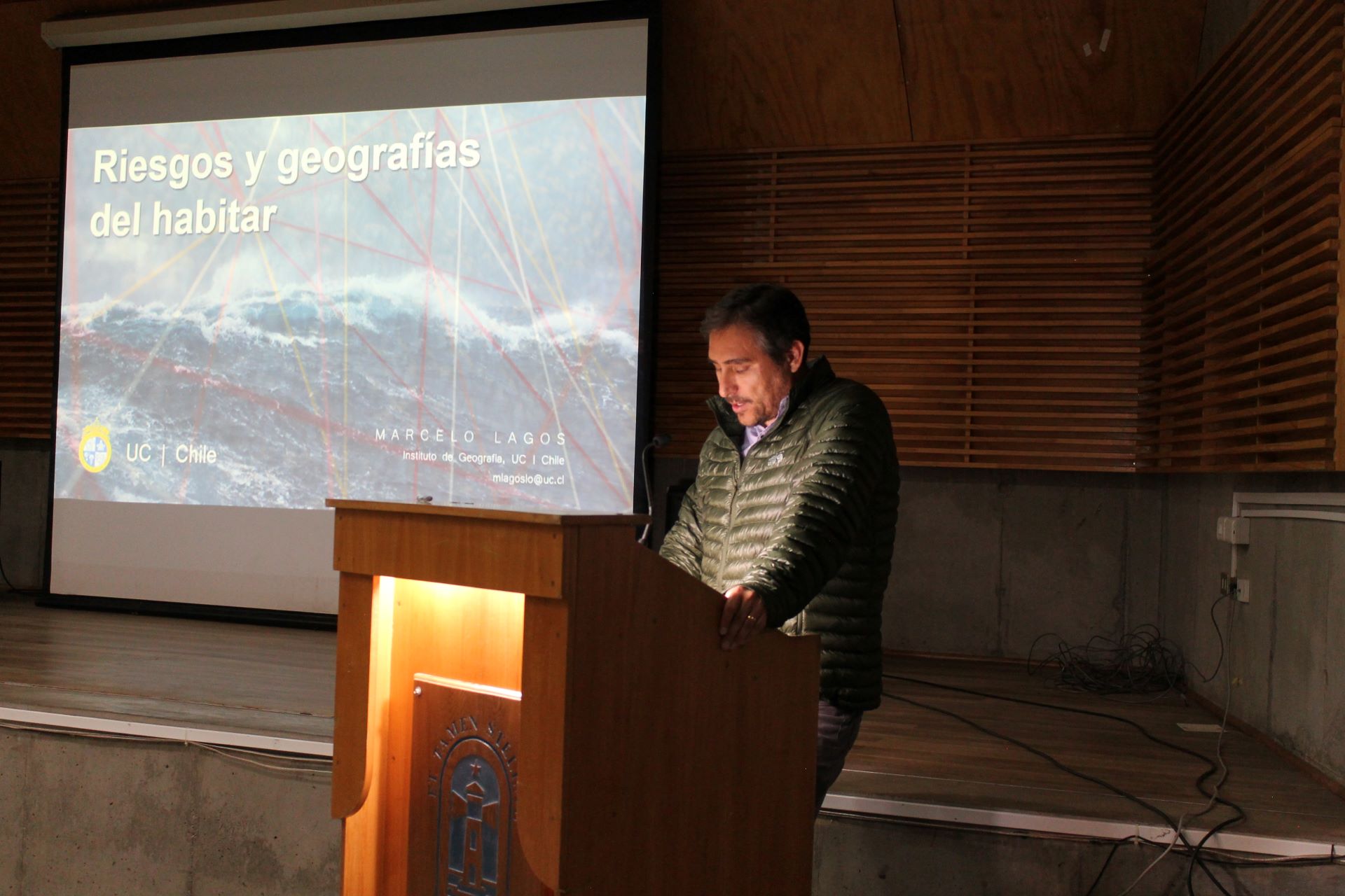 El evento contó con la participación del destacado geógrafo y académico, Dr. Marcelo Lagos López, quien dictó la charla magistral titulada «Riesgos y geografías del habitar», centrada en los desafíos globales y locales ante el cambio climático y la gestión de riesgos.