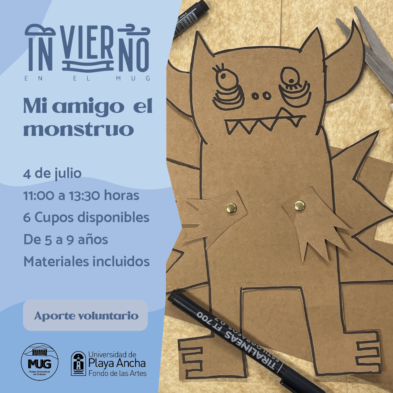 Todos los talleres incluyen materiales y se realizarán en el MUG-UPLA, ubicado en Lautaro Rosas 485, Cerro Alegre, en el horario desde las 11:00 hasta las 13:30 horas. Cuentan con 6 cupos previa inscripción al correo mediacion@mugupla.cl y funcionan con aporte voluntario.