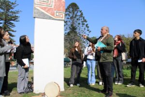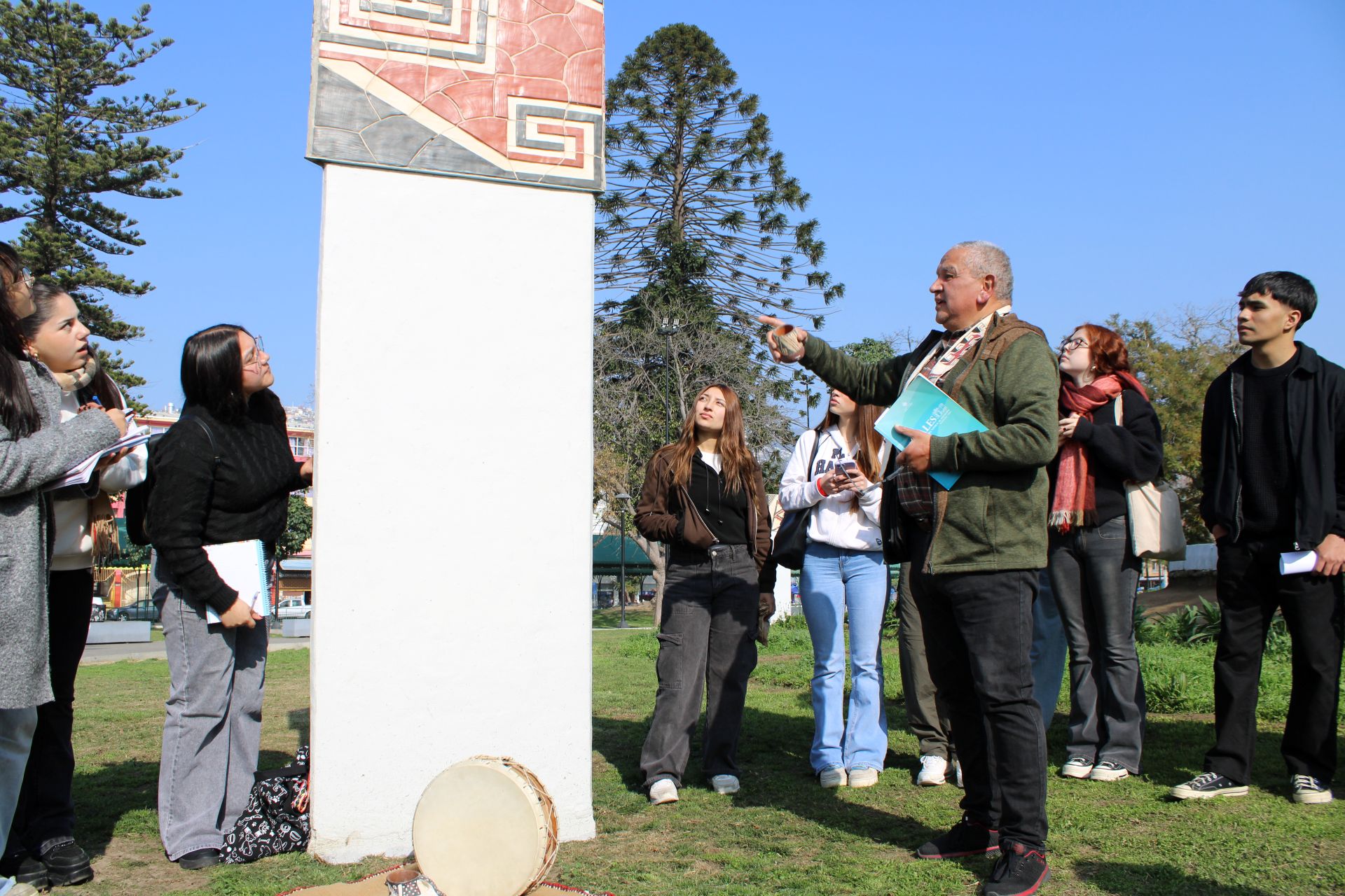 Otra sección del curso visitó la Plaza O’Higgins, sitio arqueológico donde se hallaron vestigios indígenas durante obras urbanas, lo que dio pie a una conversación con el educador intercultural y dirigente diaguita Gastón Vera, vicepresidente de la Comunidad Diaguita Campillay Guacalagasta.