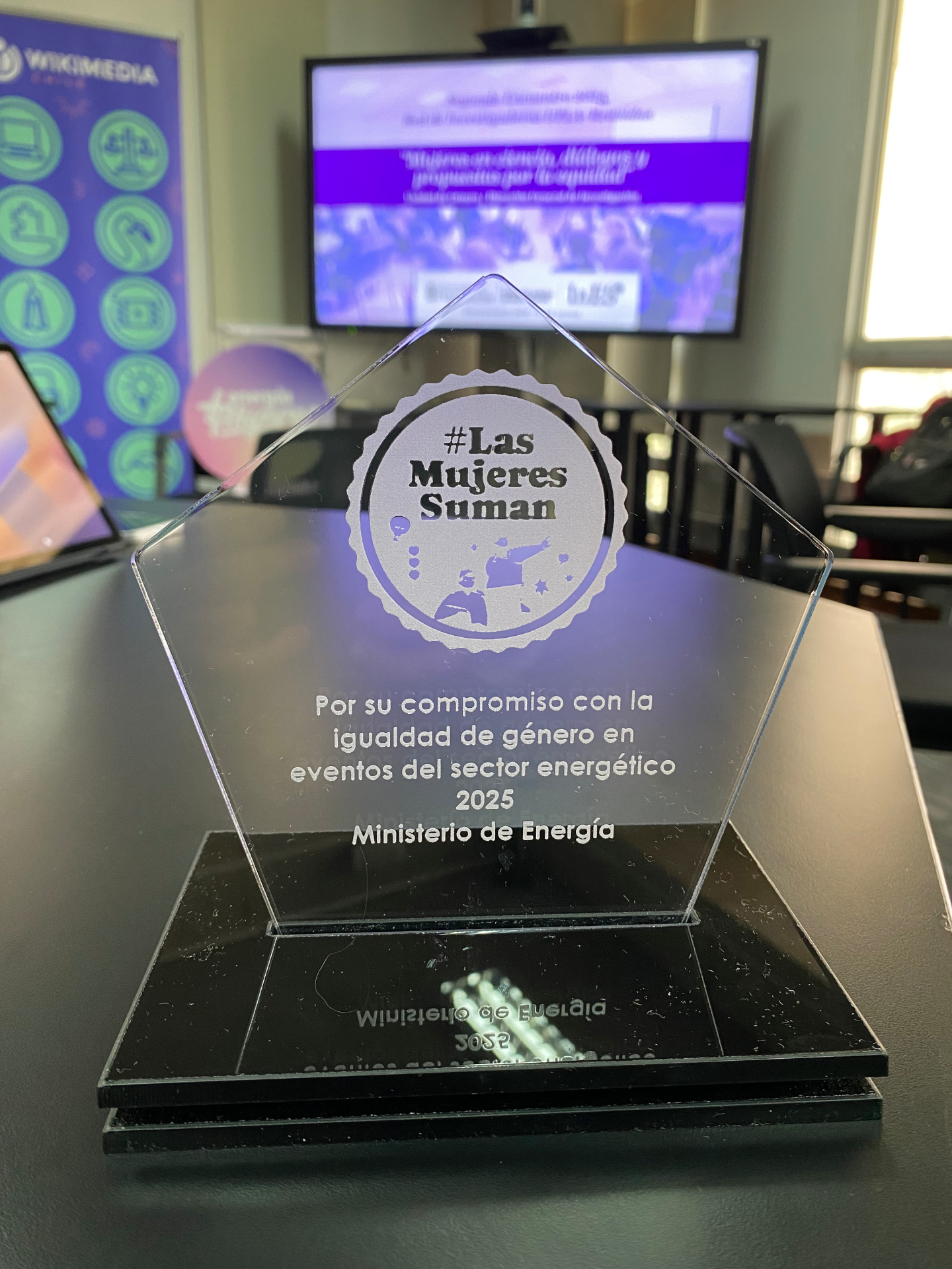 La coordinadora de la Unidad de Género de la Dirección General de Investigación y del proyecto InES Género, Karimme Morales Aguirre, recibió la distinción entregada por las profesionales de la SEREMI de Energía de Valparaíso Pamela Avaca y Carolina Salvo, presentes en la actividad.