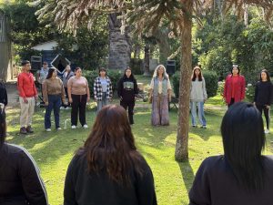 Ana María Barros Hoffman, docente de la carrera de Educación Parvularia, explicó la dinámica de la actividad sobre la alteridad: «Esta actividad la denominamos conciencia corporal y tenía instancias de la presencia, de tomar contacto con la presencia a través de la respiración para el momento del ahora. Después hicimos un poco de danzas circulares… para ver el tema que íbamos a trabajar, que era Alteridad, que era esto, vivirlo con el cuerpo, con la corporalidad, más que nada hacer el contacto visual, primero mirarse… para ver esto y reconocer a un otro… lo que tiene que ver con el juego como herramienta pedagógica y como una parte esencial, no solamente de la infancia, sino que siempre del ser humano.»
