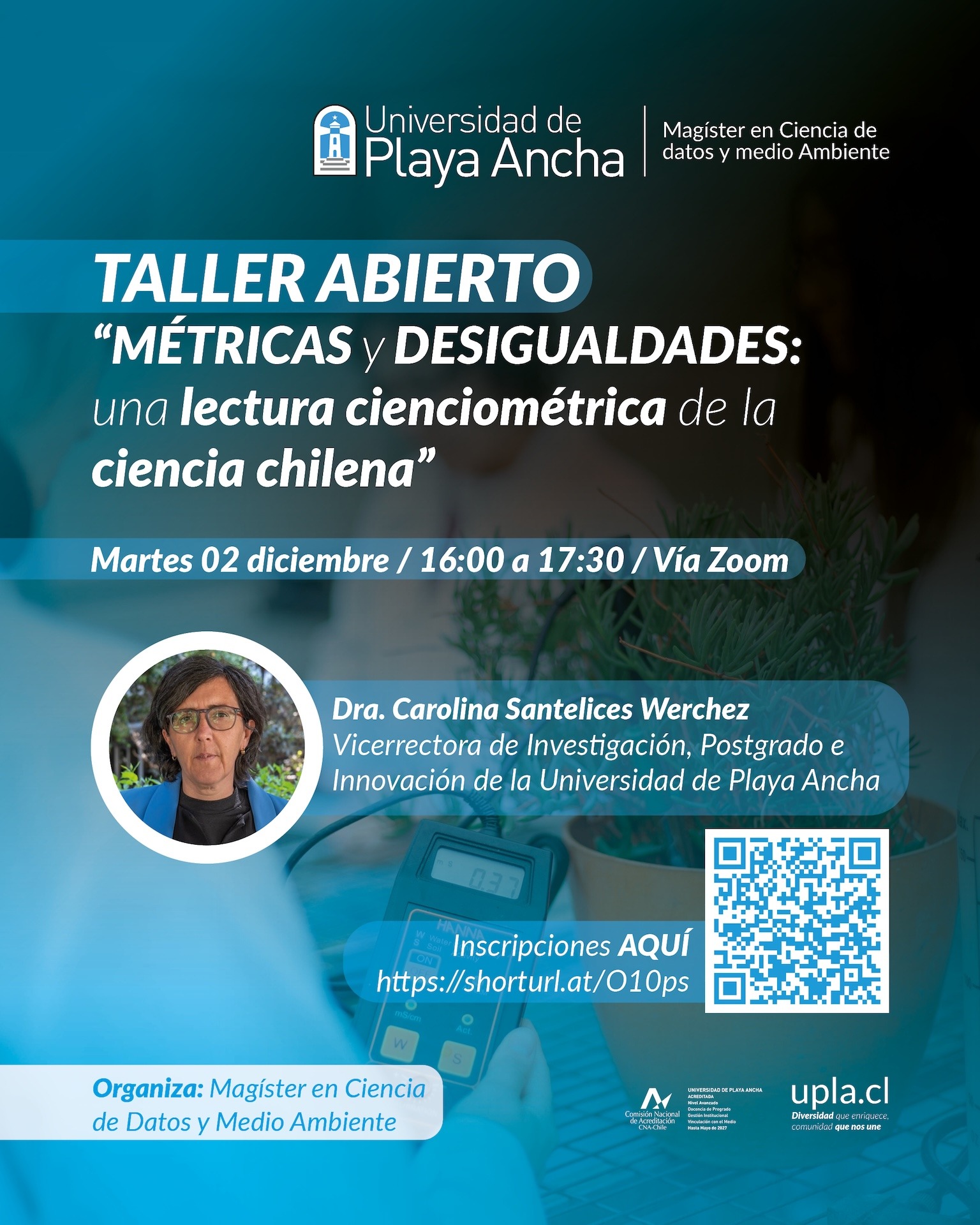 En un mundo donde la ciencia de datos se ha convertido en la herramienta esencial para abordar los desafíos más complejos, el Magíster en Ciencia de Datos y Medio Ambiente de la Facultad de Ingeniería de la Universidad de Playa Ancha (UPLA) anuncia un Taller Abierto que promete ser un punto de encuentro para profesionales e investigadores/as. La actividad, titulada «Métricas y desigualdades: una lectura cienciométrica de la ciencia chilena», se realizará el próximo martes 2 de diciembre de 2025, de 16:00 a 17:30 horas, vía Zoom. Esta instancia no solo brindará conocimientos de vanguardia, sino que también destacará el valor inigualable de matricularse en este programa de postgrado de carácter académico.