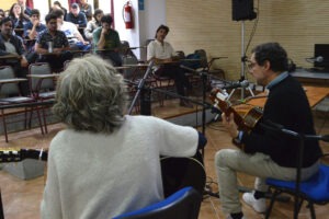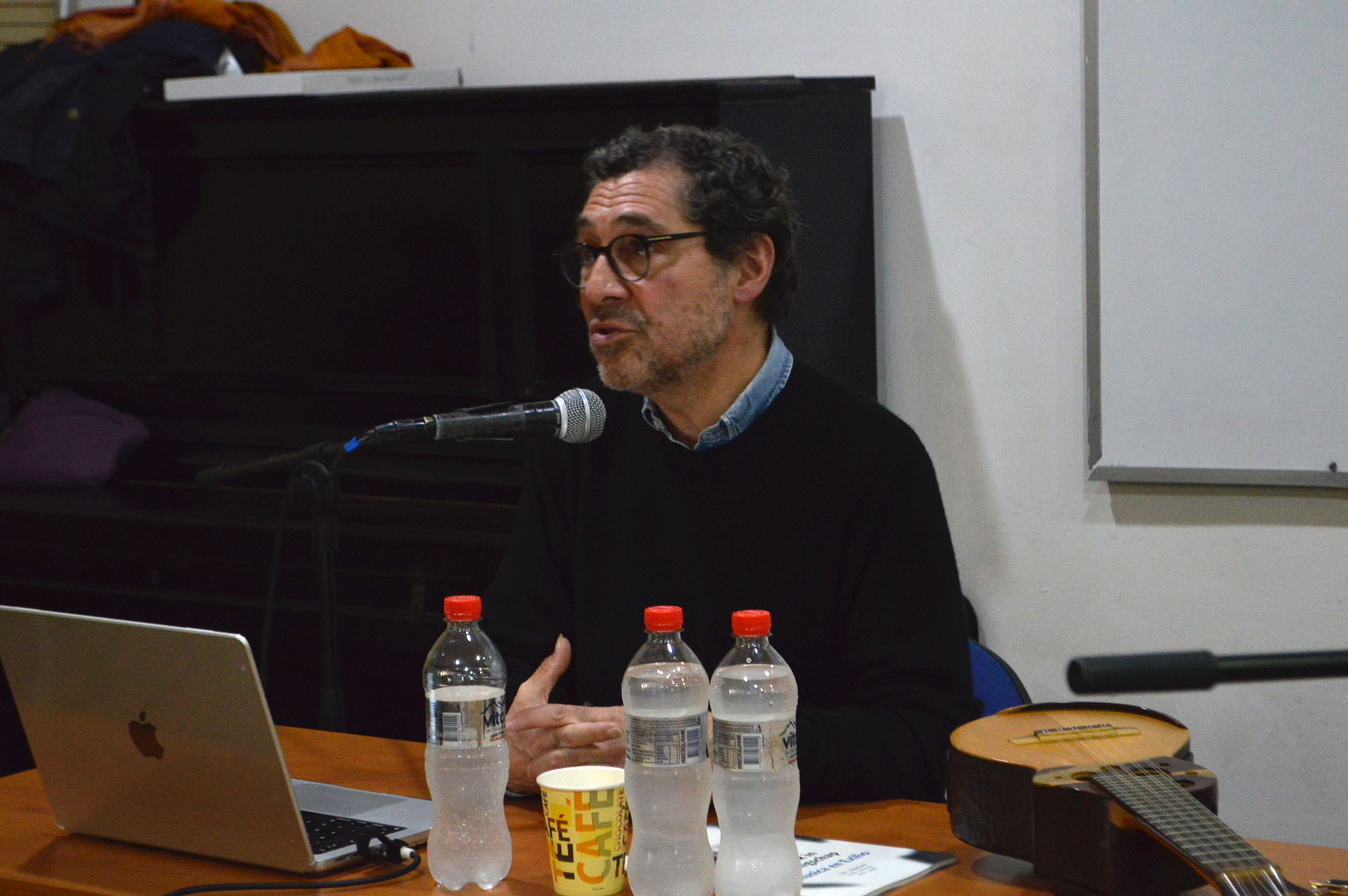 El compositor conocido, sobre todo en Chile, como renovador de la música de Quilapayún abordó en su exposición las distintas aristas de su proceso creativo, los aspectos interpretativos de sus composiciones y experiencias de vida en la formación de agrupaciones musicales; además de generar un relato abierto y franco con estudiantes respecto de su historia en el exilio que fue complementando con interpretaciones de obras musicales (en guitarra) en compañía de Winanda van Vliet.