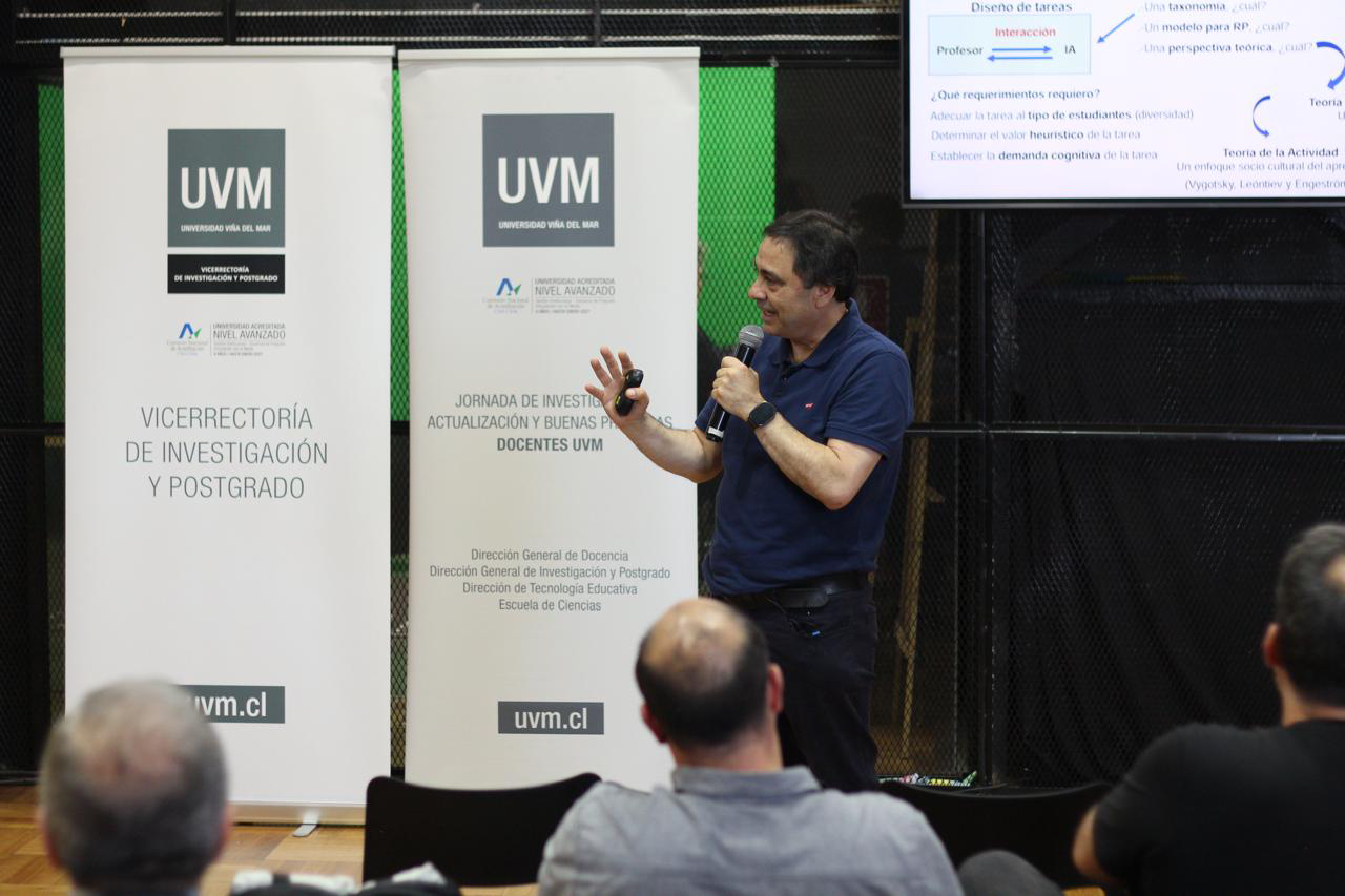 Un análisis crítico de la interacción entre profesores, estudiantes e inteligencia artificial presentó el director del Laboratorio de Aprendizaje, Educación y Tecnología (LAETEC) de la Universidad de Playa Ancha, Dr. M. Alejandro Rodríguez Jara, en la Sexta Jornada de Investigación, Actualización y Buenas Prácticas en Docencia Universitaria, organizada por la Universidad Viña del Mar (UVM).