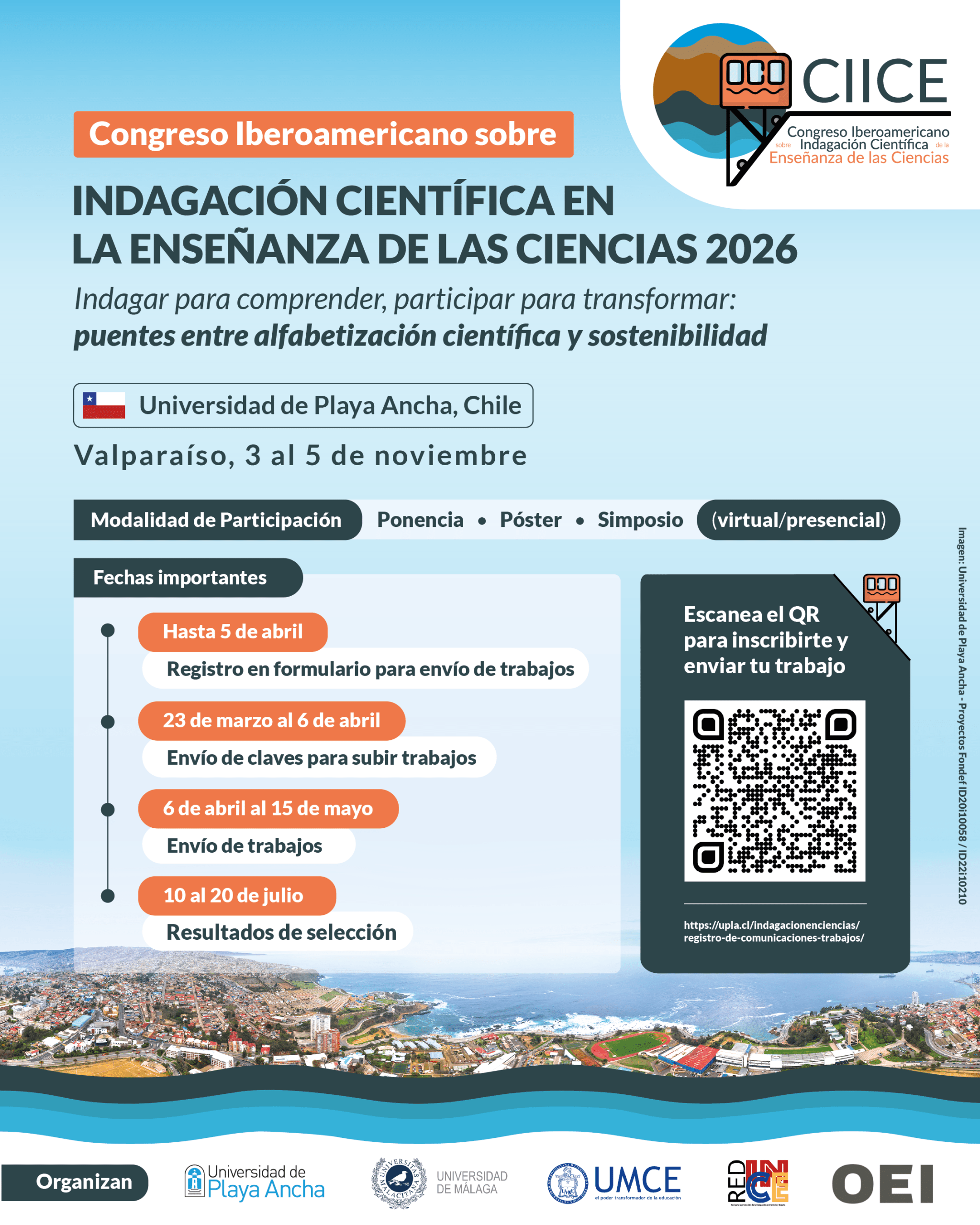 En un esfuerzo conjunto por transformar la enseñanza de las ciencias y bajo el lema “Indagar para comprender, participar para transformar: Puentes entre alfabetización científica y sostenibilidad”, la Universidad de Playa Ancha, a través de la Facultad de Ciencias Naturales y Exactas, junto a la Universidad de Málaga, invitan a participar en el Congreso Iberoamericano sobre Indagación Científica (CIICE) 2026, que se realizará entre el 3 y 5 de noviembre en ambas casas de estudio, en modalidad presencial y virtual para expositores y oyentes.