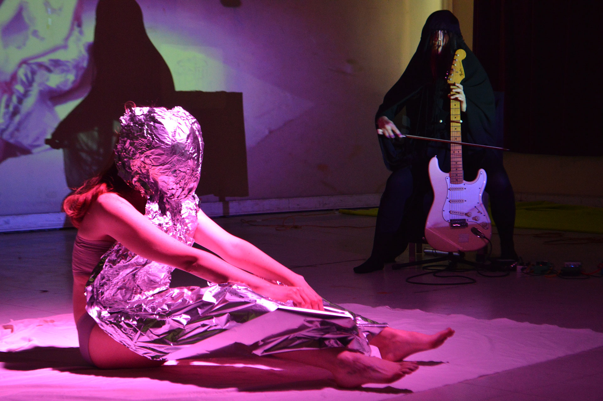 Tercero: Las estudiantes Francisca De La Fuente y Lourdes Castro, realizaron una performance sonora proyectada en tiempo diferido que, a partir de una cita de la artista y bióloga Sayaka Fujio, aborda la pregunta sobre la reconstrucción de la inocencia desde la memoria corporal, la repetición de las historias y el uso del material como molde del cuerpo, abriendo una reflexión sobre lo que permanece y se transforma.