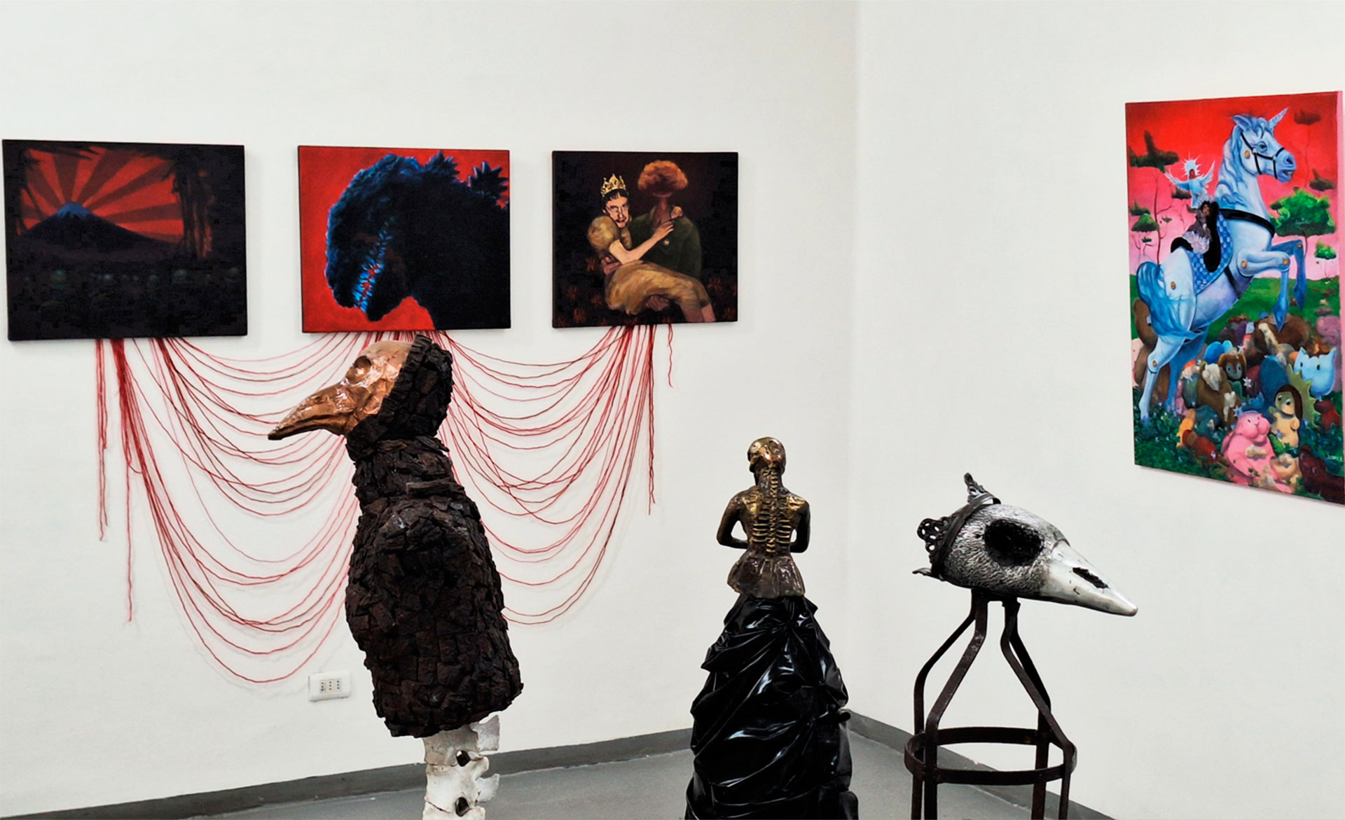 La muestra abordó, desde una perspectiva crítica y simbólica, las múltiples formas en que la violencia, la guerra y la devastación han permeado la sensibilidad contemporánea. A través de diversos lenguajes; pintura, gráfica, instalación, textil, objeto y visualidad urbana, la exposición construyó un recorrido donde la metáfora y la sugerencia reemplazaron toda literalidad, invitando al público a reflexionar sobre la normalización del horror y la pérdida progresiva de la capacidad de asombro frente a la tragedia.