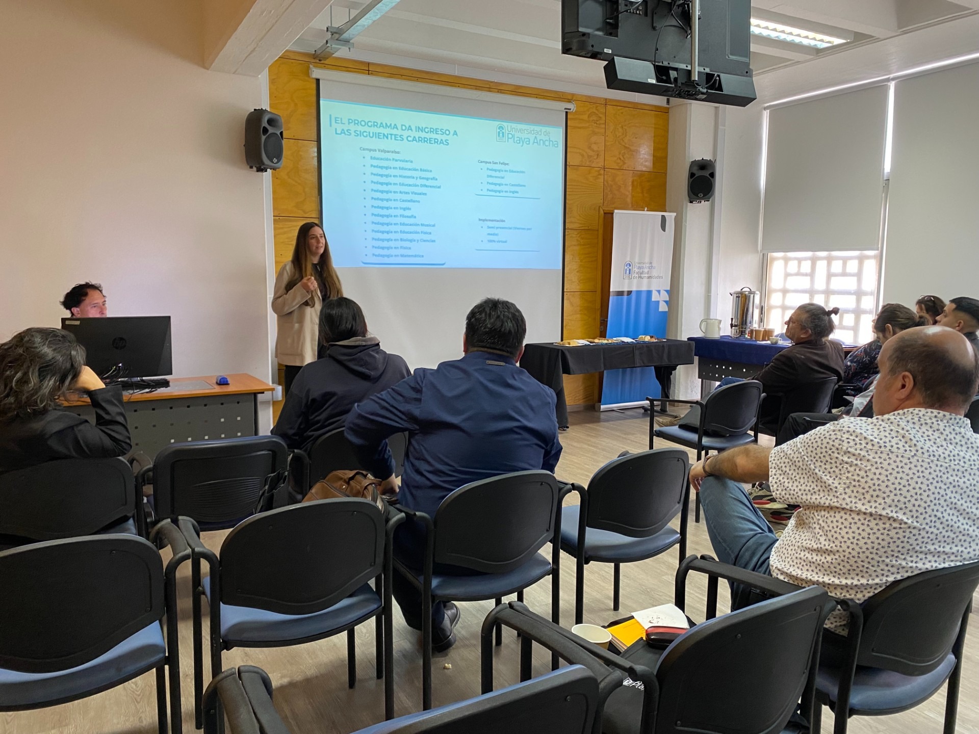 Con la presencia de representantes de 27 establecimientos de la Región de Valparaíso, la directora de Admisión y Selección de Alumnos, Claudia Valenzuela Mateluna; junto a Macarena Sanders Frioli y Augusto Contreras Gómez dieron a conocer en los campus de Valparaíso y San Felipe las distintas alternativas formativas que plantea esta vía de ingreso especial a la educación superior, que promueven el ingreso a carreras pedagógicas, profesionales, de teatro e ingenieriles.