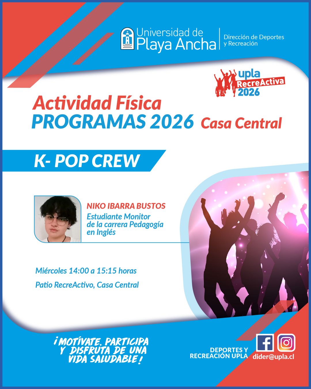 En el patio RecreActivo de Casa Central a contar del miércoles 29de abril, el programa «K-Pop Crew» les espera de 14:00 a 15:15 horas, dirigido por Niko Ibarra Bustos, estudiante de segundo año de Pedagogía en Inglés.