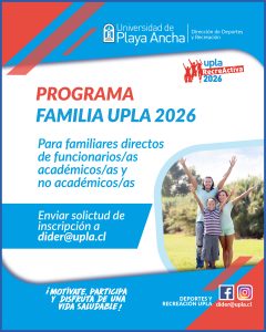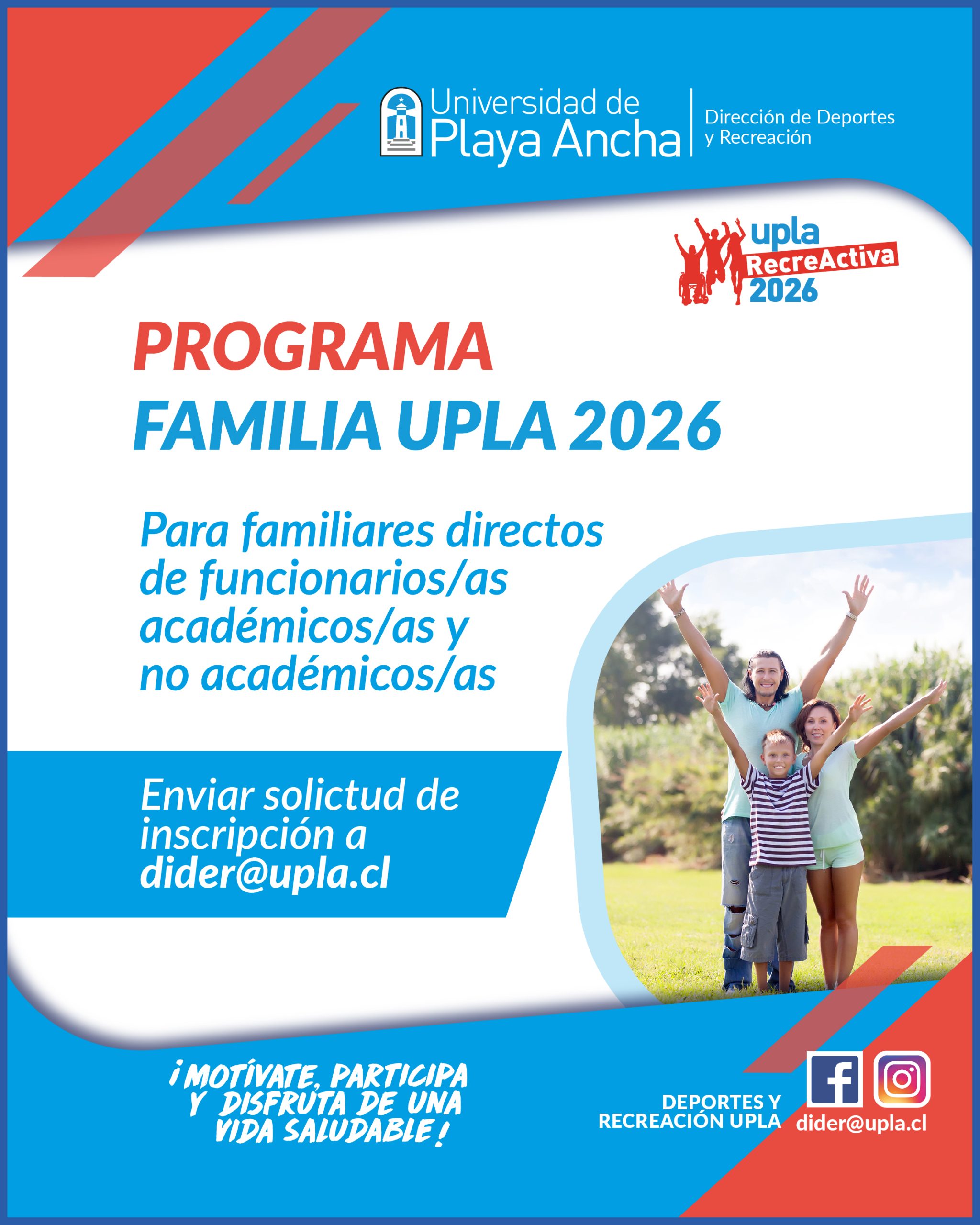 La Dirección de Deportes y Recreación (DIDER) invita a participar en el programa “Familia UPLA 2026”, iniciativa que busca extender los beneficios de la vida saludable integrando a los seres queridos de quienes dan vida a nuestra institución.