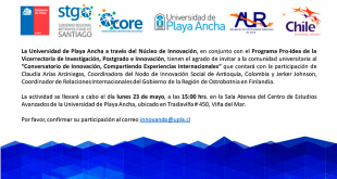 A las 15 horas comenzará en la Sala Atenea del Centro de Estudios Avanzados conversación entre especialistas de Colombia y Finlandia. Interesados confirmar participación en innovando@upla.cl.