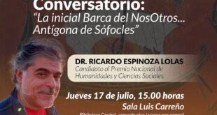 Ricardo Espinoza Lolas ofrecerá la ponencia “La inicial Barca del NosOtros... Antígona de Sófocles” en la Sala Luis Carreño Silva, el jueves 17 de julio a contar de las 15:00 horas.