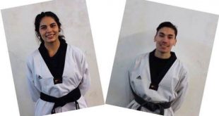 Los taekwondistas Joaquín Sánchez y Fernanda Aguirre junto al entrenador José Zapata, se medirán con los mejores deportistas de 32 países en el torneo brasileño.