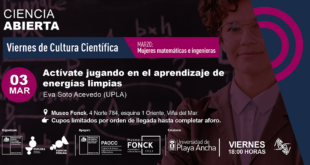 El ciclo comienza con la charla “Actívate jugando en el aprendizaje de energías limpias” de la directora del Departamento de Ciencias de la Ingeniería para la Sostenibilidad de la UPLA, Eva Soto Acevedo, este viernes 3, a las 18.00 horas en el Museo Fonck de Viña del Mar.