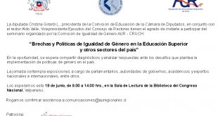 "Brechas y Políticas de Igualdad de Género en la Educación Superior y otros sectores del país" es el nombre del seminario que se realizará de 9 a 14 horas en la Sala de Lectura de la Biblioteca del Congreso Nacional de Valparaíso.