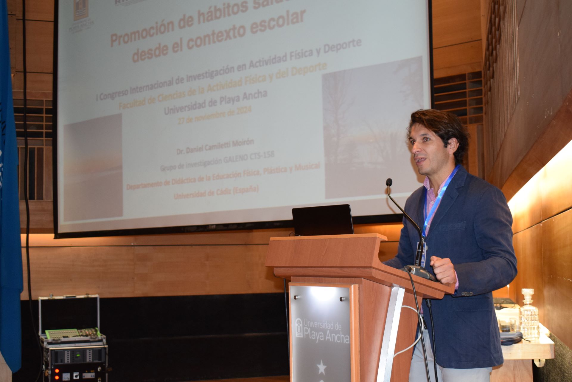 La primera conferencia internacional estuvo a cargo del académico de la Universidad de Cádiz, España, Dr. Daniel Camiletti Moiron, quien se refirió a la “Promoción de hábitos saludables desde el contexto escolar”.