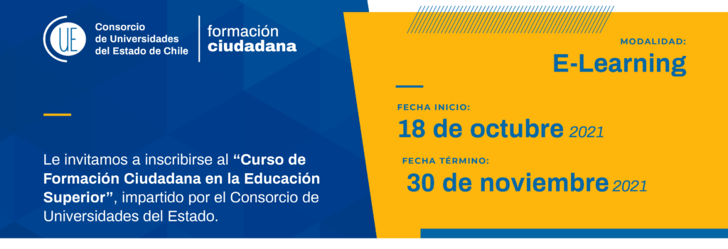 La Dirección General de Pregrado y la Unidad de Acompañamiento Docente, dependientes de la Vicerrectoría Académica, invitan a académicos, académicas, funcionarios y funcionarias a inscribirse en el “Curso de Formación Ciudadana en la Educación Superior” del Consorcio de Universidades del Estado de Chile (CUECH).