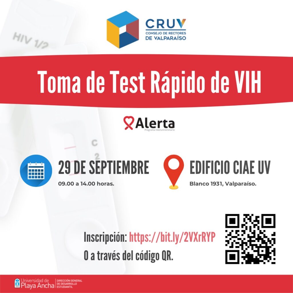 La Dirección General de Desarrollo Estudiantil, dependiente de la Vicerrectoría Académica, invita a los y las estudiantes de la Universidad de Playa Ancha a realizarse el examen de detección de VIH, en un operativo de test rápido que se llevará a efecto el próximo 29 de septiembre, entre las 9.00 y las 14.00 horas, en el Centro Integral de Atención al Estudiante (edificio CIAE) de la Universidad de Valparaíso (Blanco 1931, Valparaíso).
