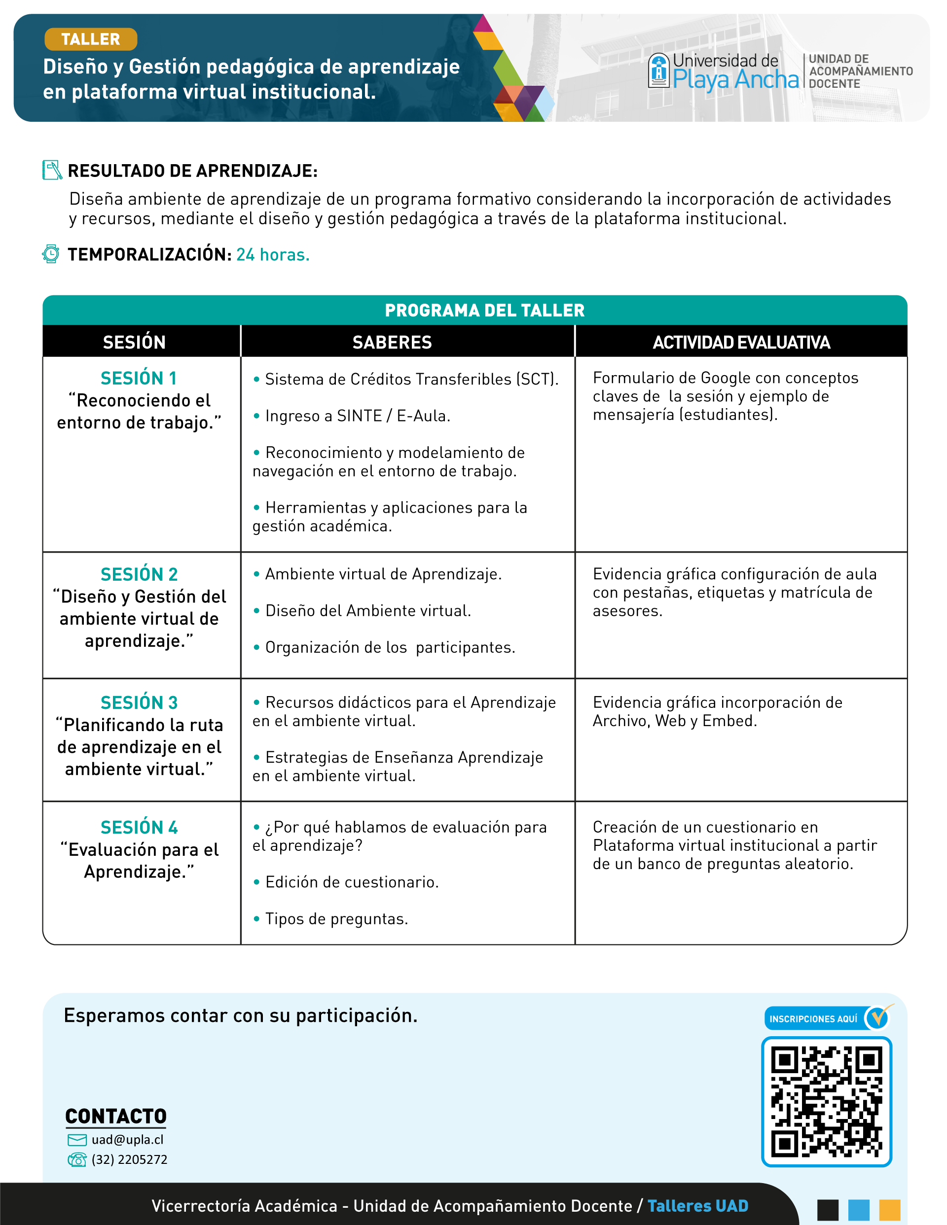 La Unidad de Acompañamiento Docente, dependiente de Vicerrectoría Académica, invita a participar en el taller “Diseño y Gestión Pedagógica de Aprendizaje en Plataforma Virtual Institucional”, actividad que se desarrollará en cuatro sesiones desde el próximo 24 de mayo (martes y jueves desde las 15.45 hasta las 17.15 horas), a través de la plataforma Zoom. Inscripción aquí.