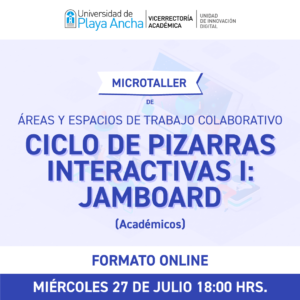 La Unidad de Innovación Digital, dependiente de la Vicerrectoría Académica, invita a la comunidad académica a inscribirse en el microtaller “Áreas y espacios de trabajo colaborativo. Ciclo de Pizarras Interactivas I: Jamboard”, el cual se efectuará este miércoles 27 de julio, a las 18.00 horas, vía Zoom (inscripción aquí).