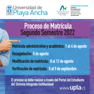 La Secretaría de Estudios, dependiente de la Vicerrectoría Académica, informa las fechas y procedimientos correspondientes al Proceso de Matrícula del segundo semestre de 2022, que inicia el próximo lunes 1 de agosto.
