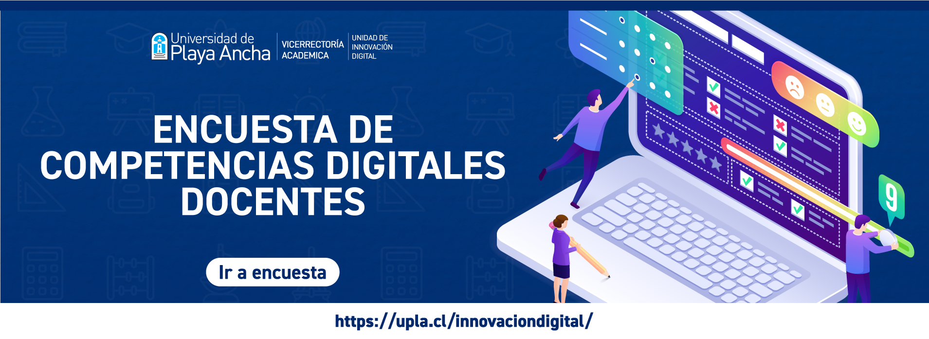 La Unidad de Innovación Digital, dependiente de la Vicerrectoría Académica, informa que en el marco del Proyecto de Fortalecimiento Institucional “Avanzando hacia una Transformación Digital en la Universidad de Playa Ancha” (UPA 2099-1), nuestra casa de estudios se encuentra implementando una encuesta vinculada a las competencias digitales de las y los académicos UPLA.