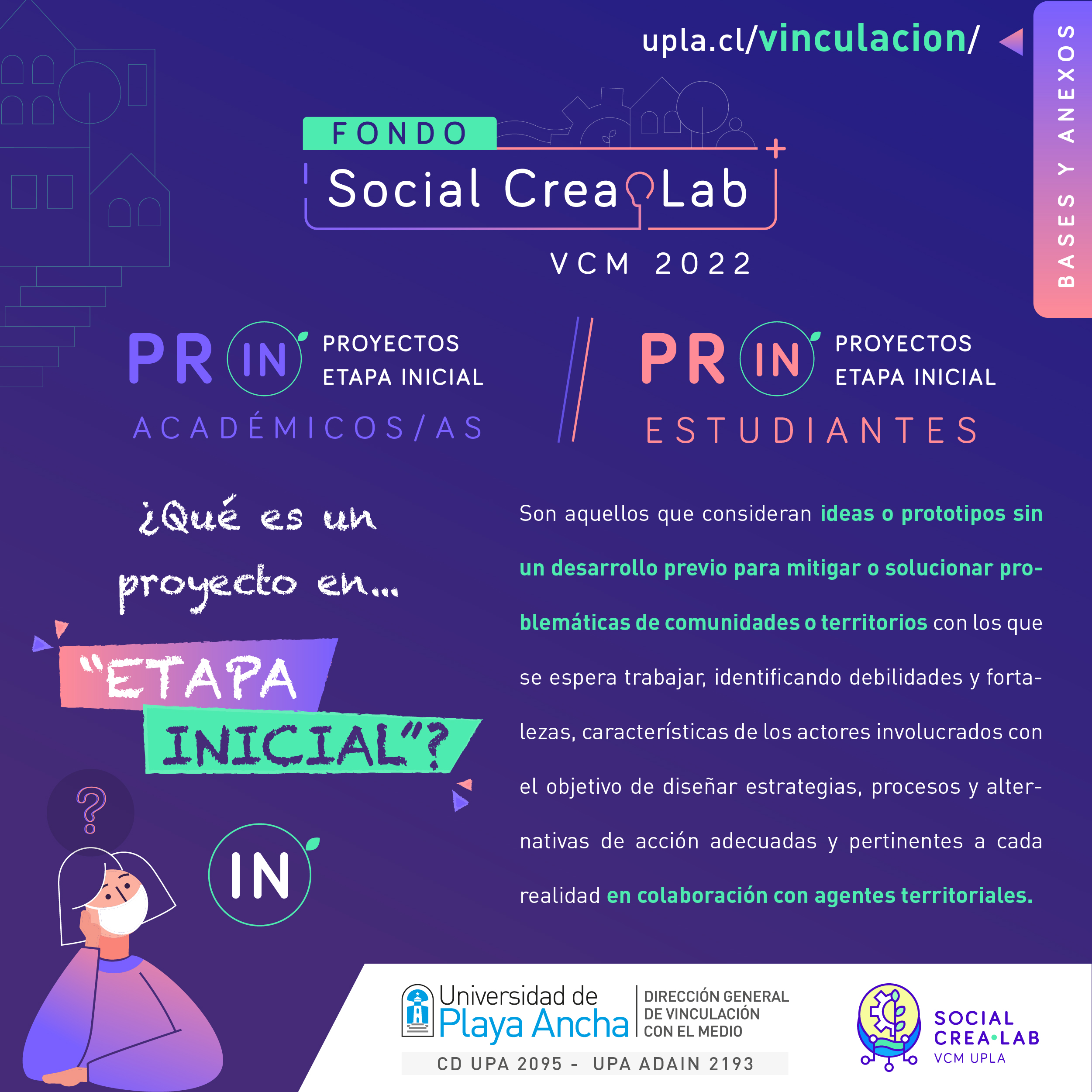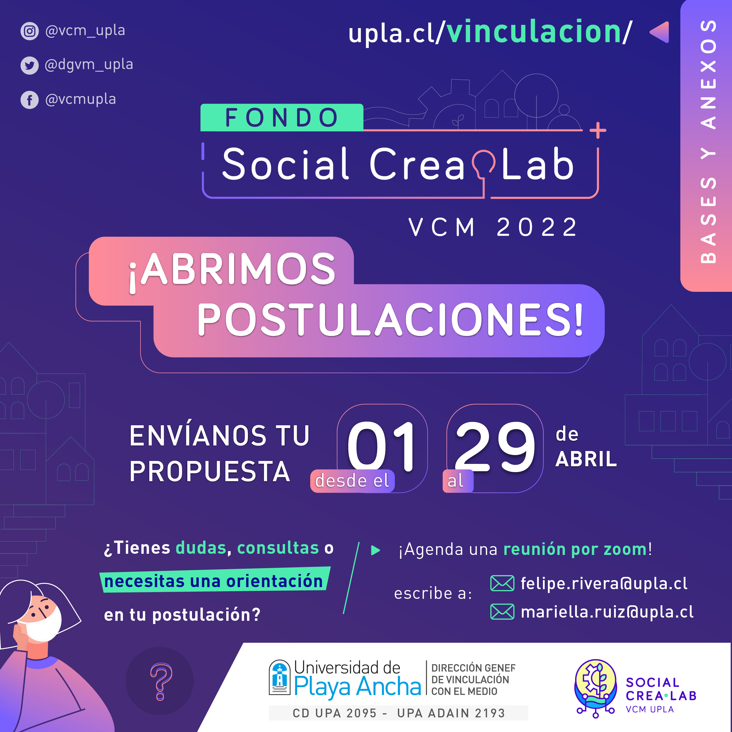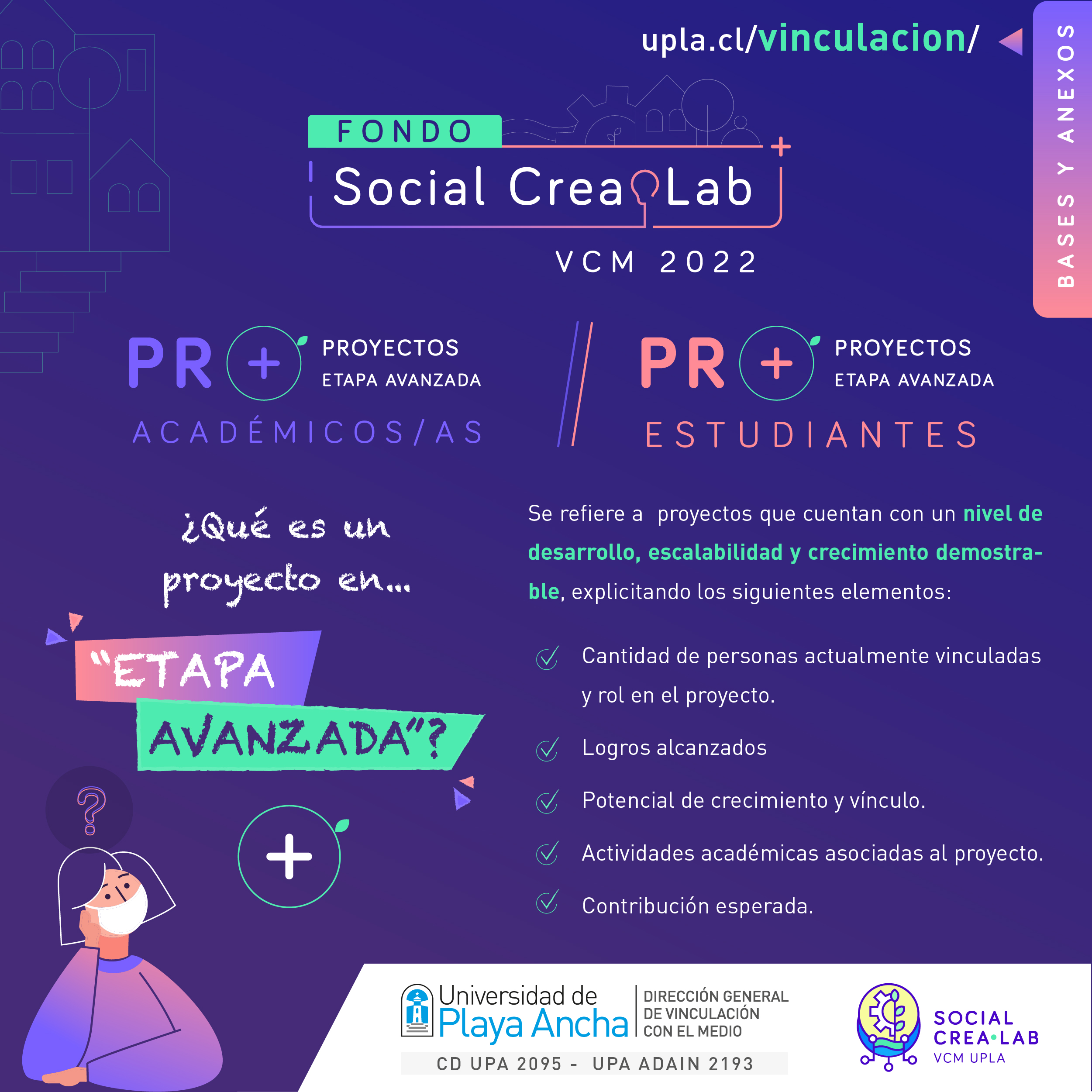 Desde el 1 hasta el 29 de abril estará abierta la convocatoria para el Fondo Social CreaLab 2022, impulsado por la Dirección General de Vinculación con el Medio (DGVM) de la Universidad de Playa Ancha (UPLA) que busca apoyar y financiar proyectos de innovación social que se ejecuten en distintos territorios de la región de Valparaíso. Este año, el fondo tendrá dos categorías y dos subcategorías, es decir, para académicos/as y estudiantes, ambos con posibilidad de presentar propuestas en etapa inicial y etapa avanzada.