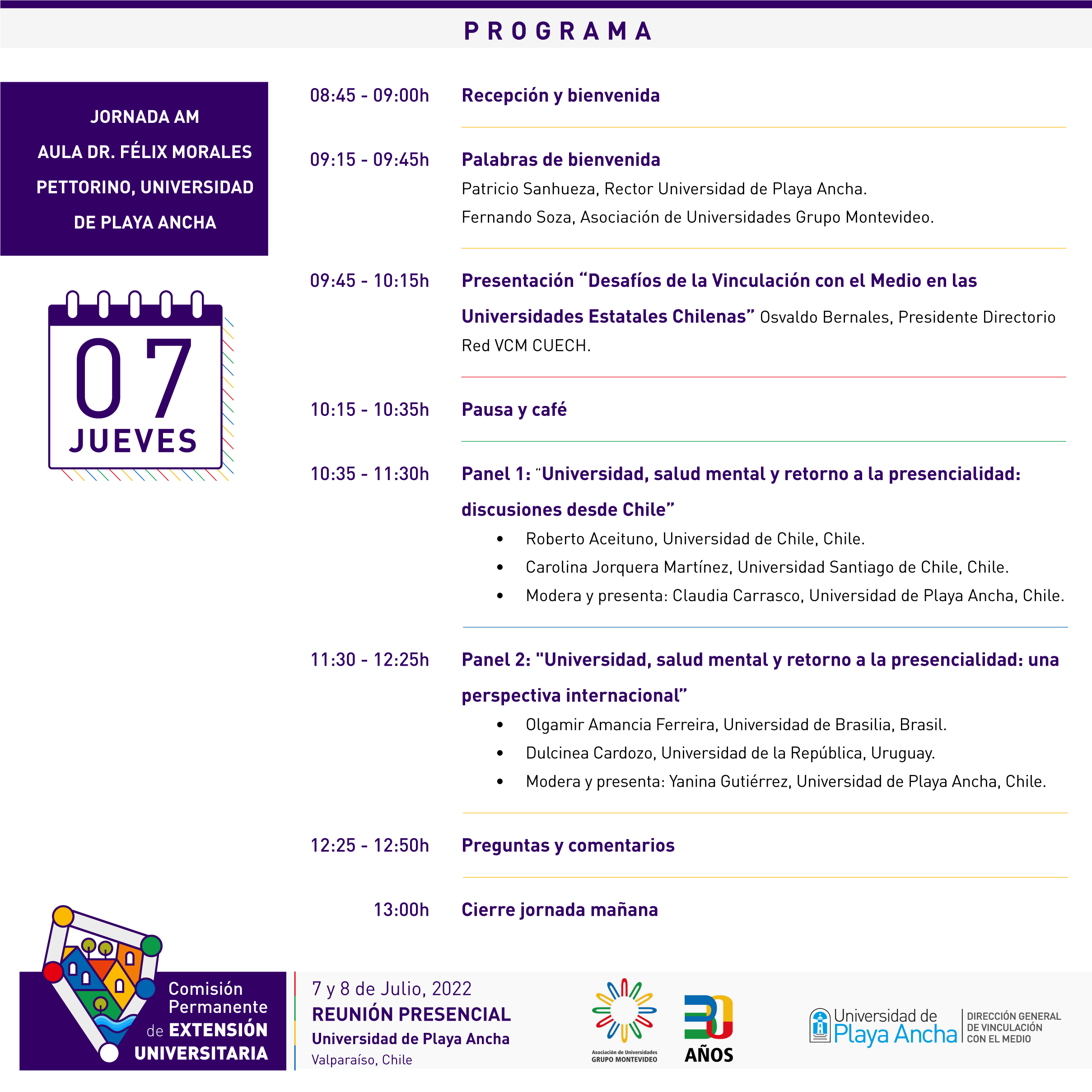La instancia, organizada por la Dirección General de Vinculación con el Medio (DGVM) de la UPLA, contará con la presentación de Osvaldo Bernales, Presidente del Directorio de la Red VCM del Consorcio de Universidades del Estado de Chile (CUECH), con la charla “Desafíos de la Vinculación con el Medio en las Universidades Estatales Chilenas”, para luego dar paso a dos paneles de conversación en torno a la salud mental y el retorno a la presencialidad tanto en Chile como en América Latina.