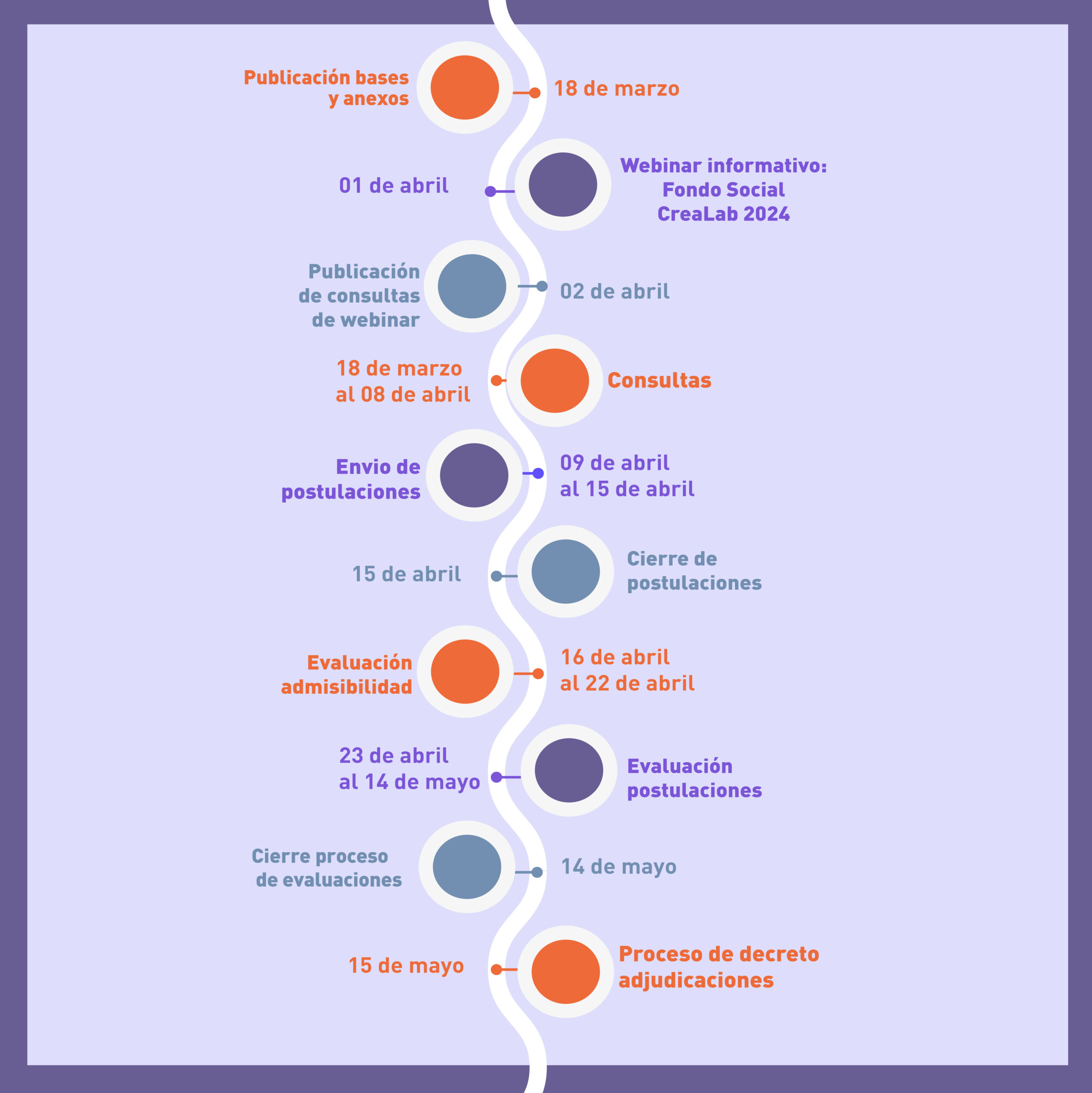 La postulación de iniciativas se podrá realizar entre el 09 y el 15 de abril de 2024, mientras que en los días previos, del 18 de marzo y el 08 de abril, quienes estén interesados/as en presentar propuestas, podrán realizar consultas respecto al proceso. Los y las académicos/as de planta y a contrata podrán ser quienes postulen, integrando obligatoriamente a estudiantes en sus equipos de trabajo, y a modo opcional a funcionarios/as y egresados/as de la casa de estudios.