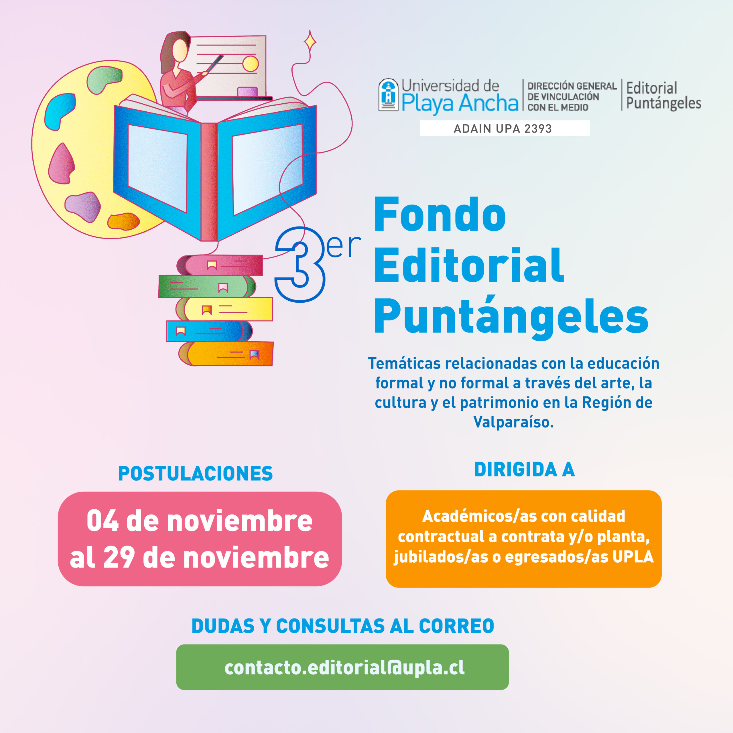 El Tercer Fondo Editorial Puntángeles abre su proceso de postulación el 04 de noviembre, el cuál finaliza el próximo viernes 29 de noviembre, a las 23:59 horas.
