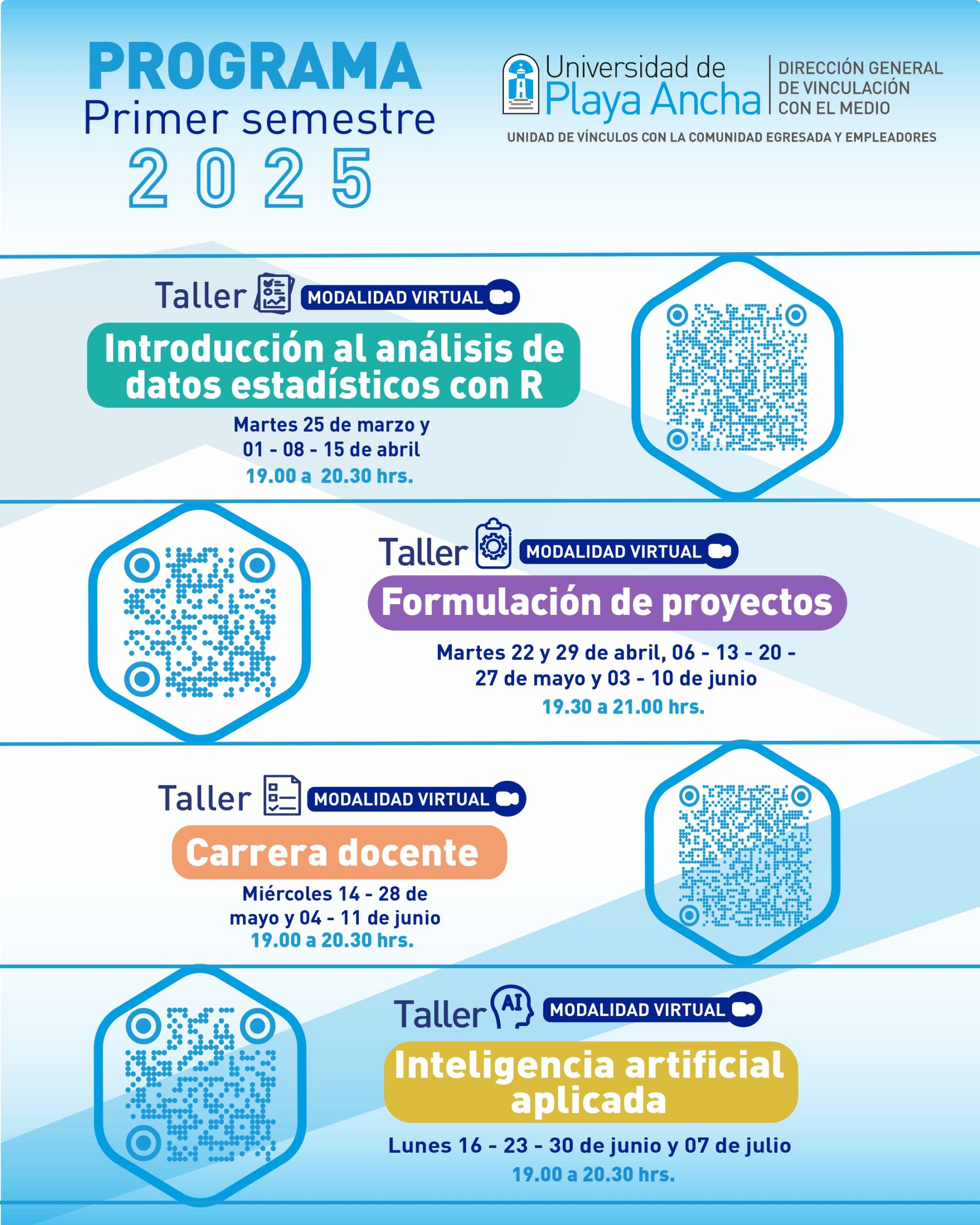 Los talleres se realizarán durante el primer semestre, en horario vespertino y en modalidad virtual.