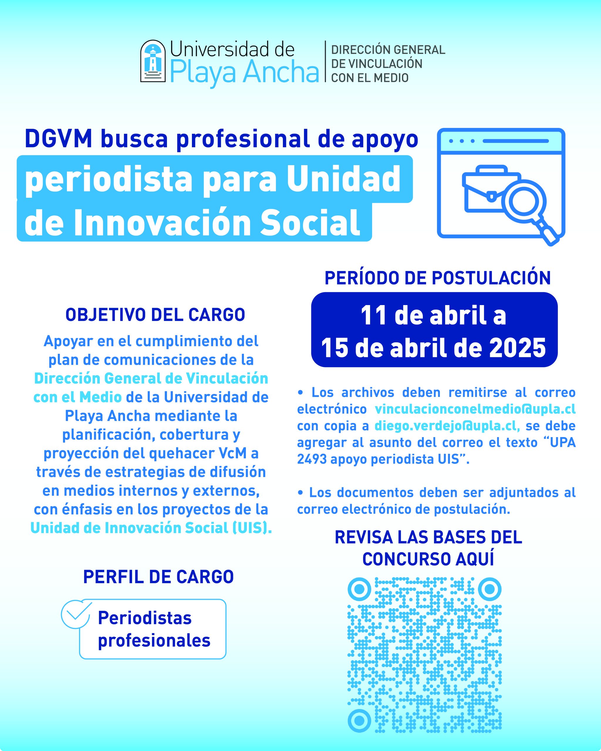 La Dirección General de Vinculación con el Medio (DGVM) de la Universidad de Playa Ancha (UPLA) requiere la contratación de profesional para el cargo de ““Profesional de apoyo periodista»  para la Unidad de Innovación Social, dependiente de la DGVM, en el marco del proyecto UPA 2493 «UPLA en comunidad: Transformando juntos para una mejor calidad de vida».