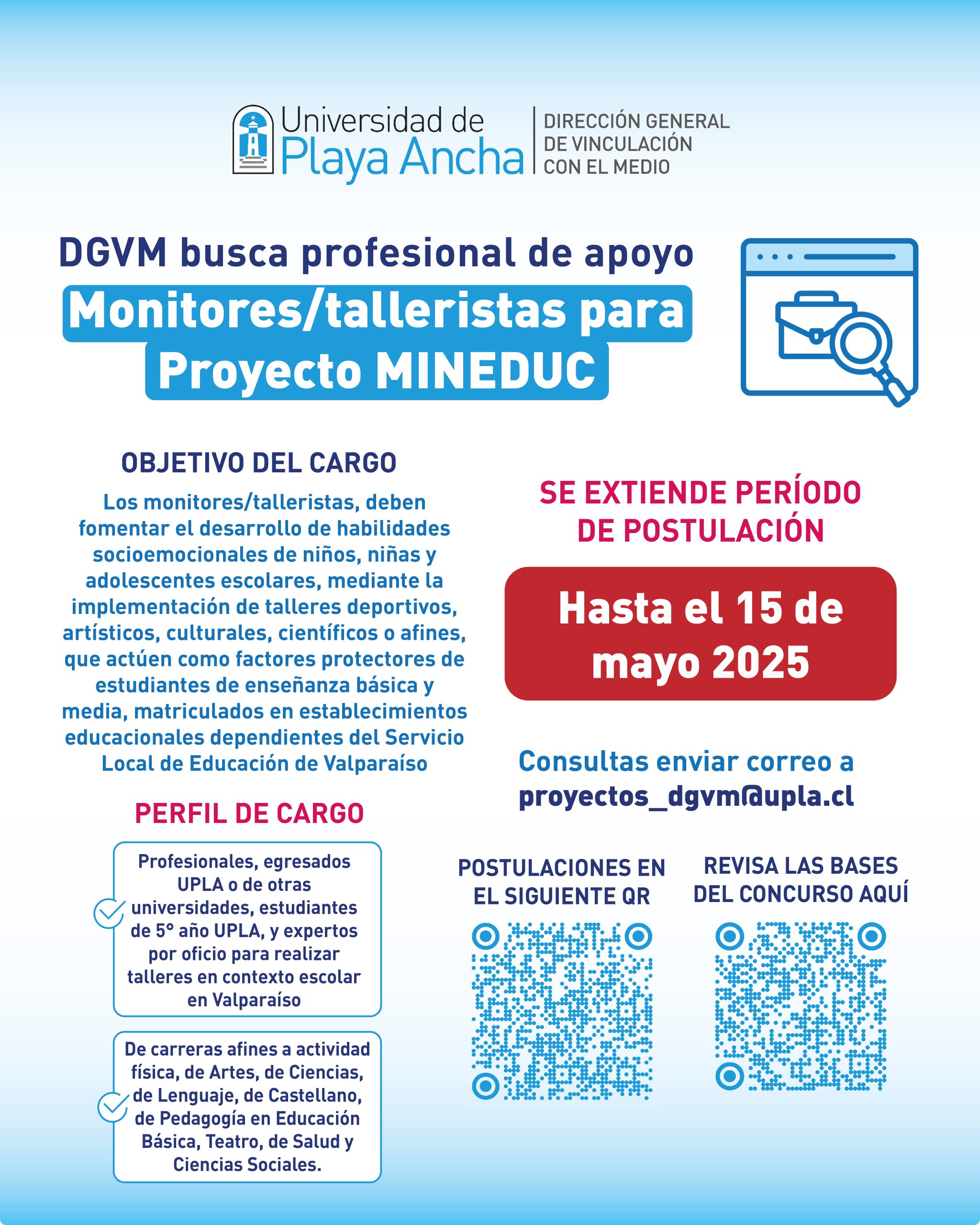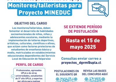La Universidad de Playa Ancha, en el marco del “Servicio de levantamiento, sistematización y propuesta de un Modelo que promueva el desarrollo de habilidades socioemocionales de los y las estudiantes pertenecientes al Servicio Local de Educación Pública (SLEP) de Valparaíso, mediante la implementación de talleres deportivos, culturales, científicos o afines, que actúen como factores protectores para la implementación del Programa Bienestar Socioemocional y Educación Integral”, llama a Concurso Público con el fin de proveer los servicios profesionales de “Monitor/Tallerista” con calidad contractual honorario de acuerdo a los valores establecidos por el MINEDUC.