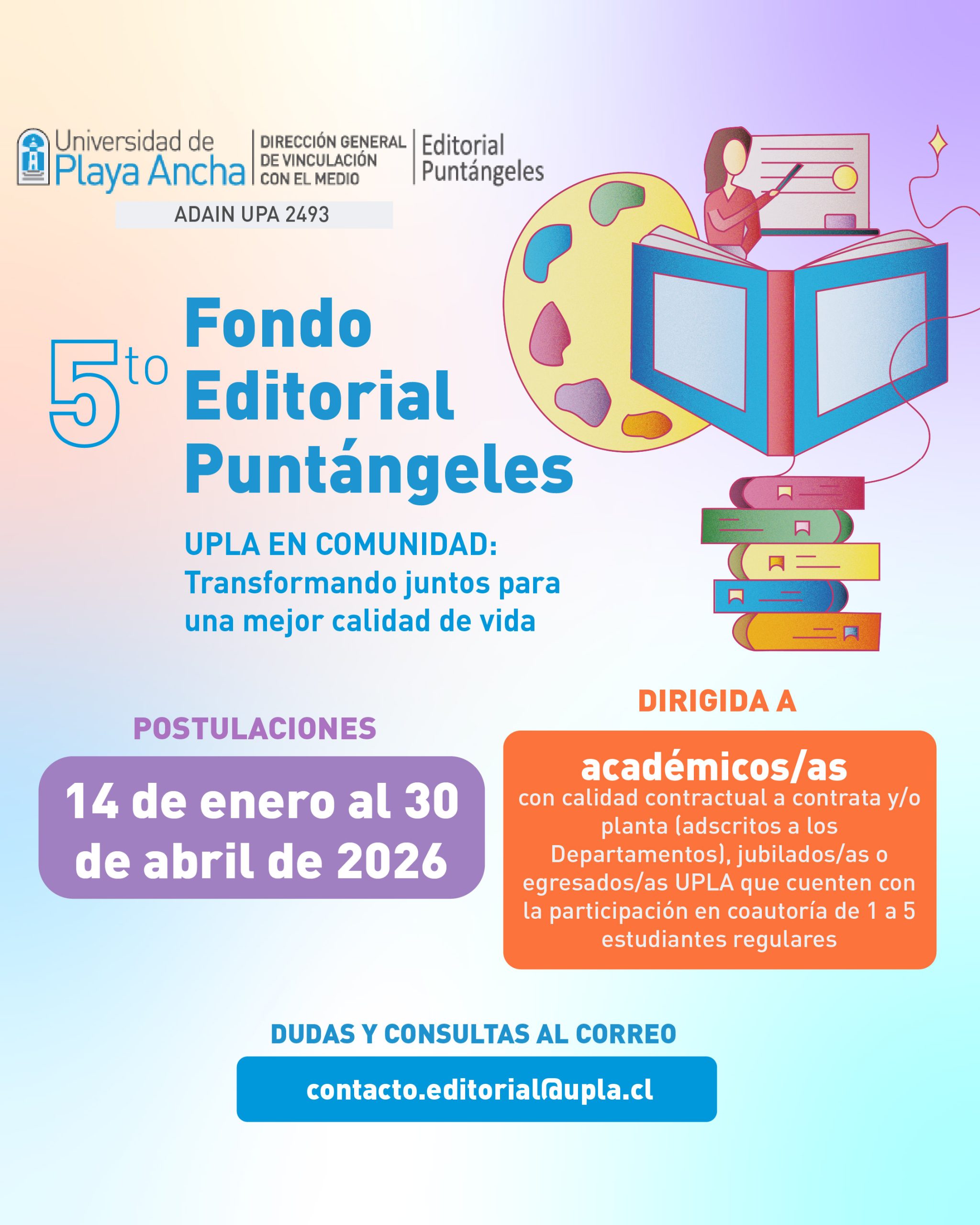Las dudas y consultas sobre el proceso de esta convocatoria se deben realizar al correo contacto.editorial@upla.cl