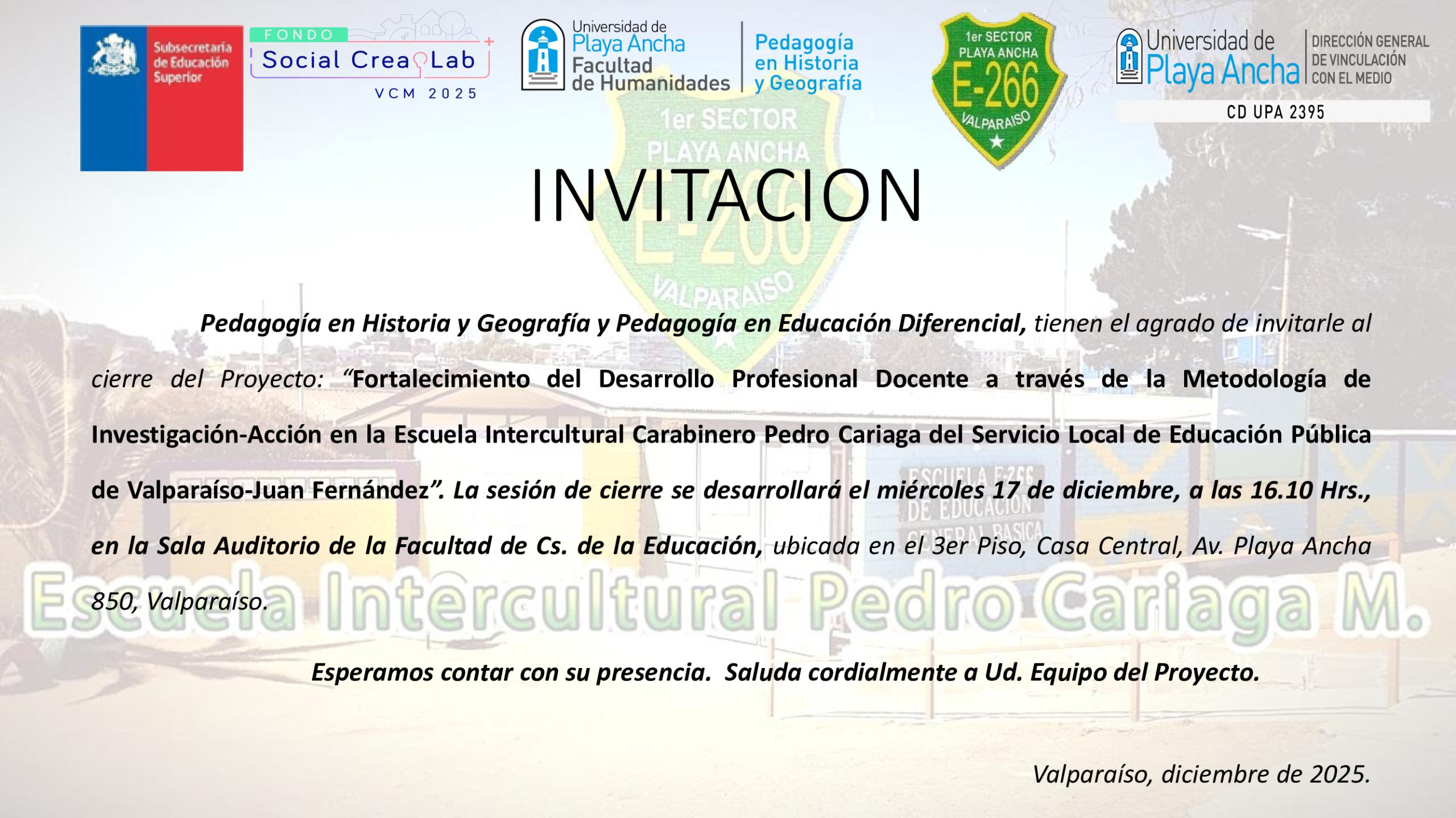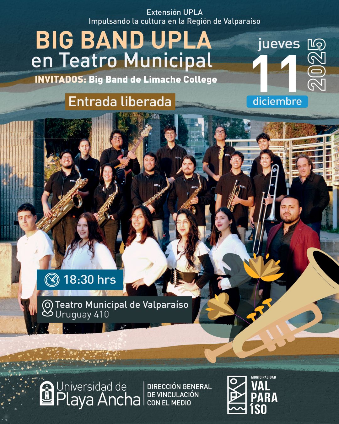 La Dirección General de Vinculación con el Medio (DGVM) extiende una invitación a toda la comunidad universitaria a la presentación de la Big Band UPLA en el Teatro Municipal de Valparaíso. En esta oportunidad contaremos con la participación especial de la Big Band Limache College, que acompañará a nuestro elenco artístico en el cierre del […]