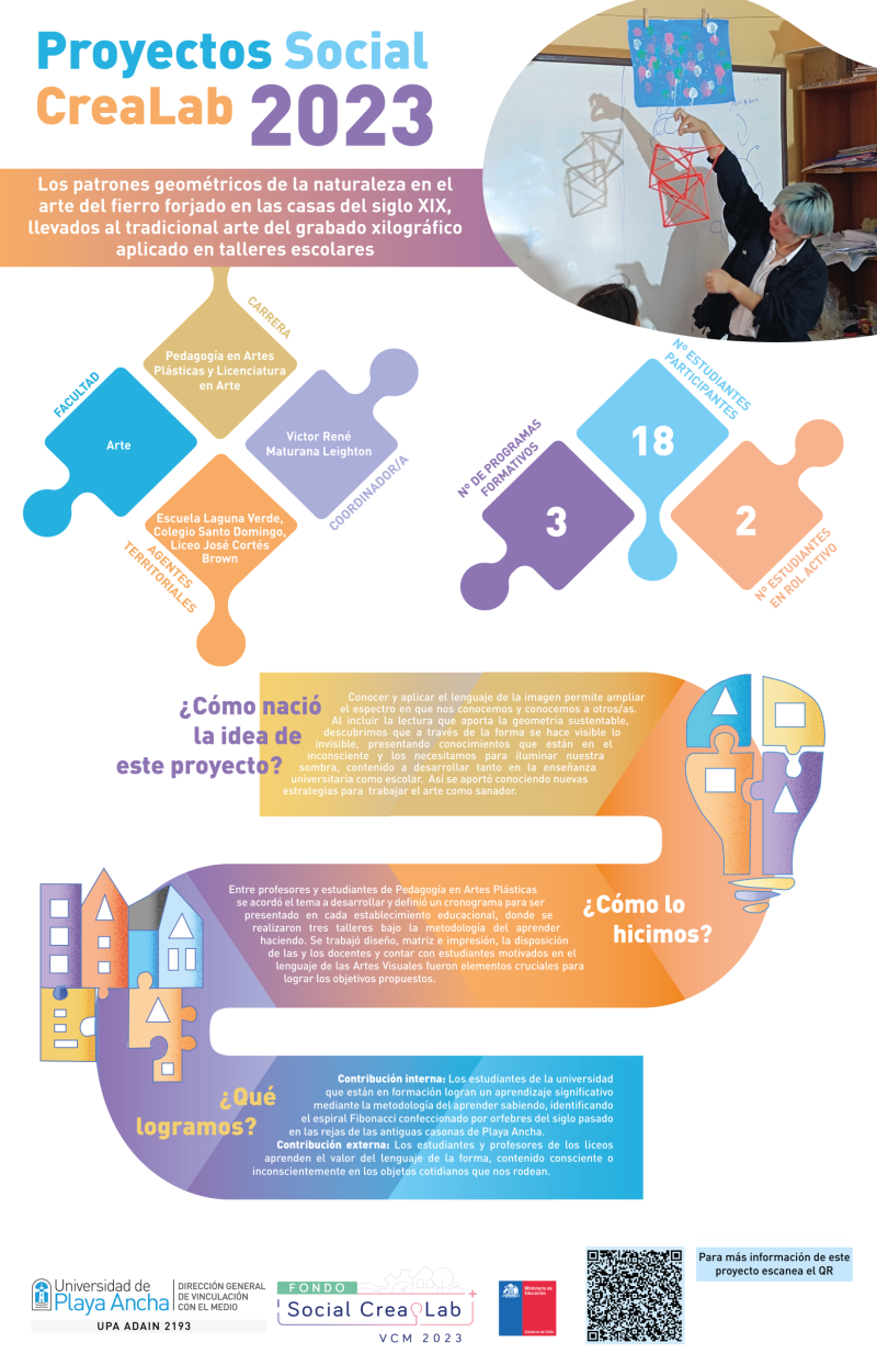 Proyecto Social Crealab 2023 «Los patrones geométricos de la naturales en el arte del fierro forjado en las casas del siglo XIX, llevados al tradicional arte del grabado xilográfico aplicado en talleres escolares»