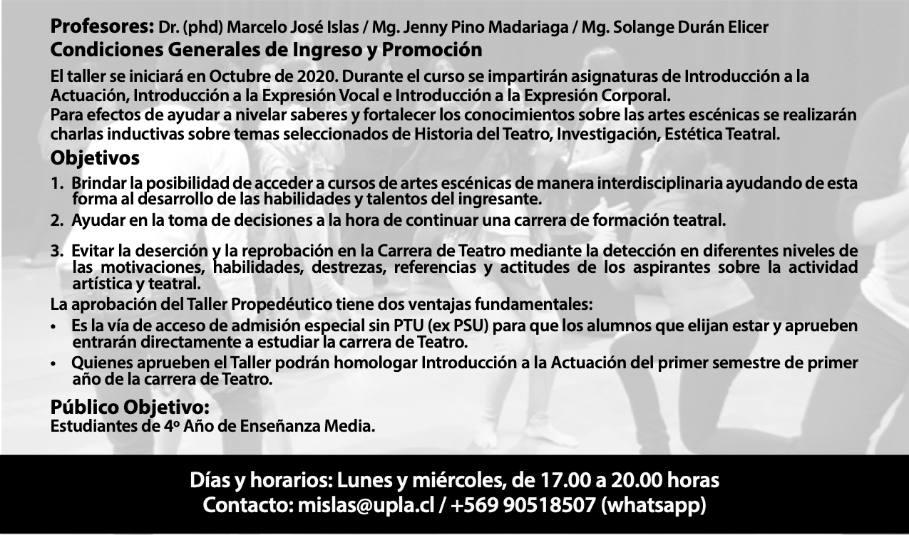 A partir del lunes 19 de octubre de 2020, la carrera de Teatro de la Universidad de Playa Ancha (UPLA) llevará a efecto su propedéutico en línea.