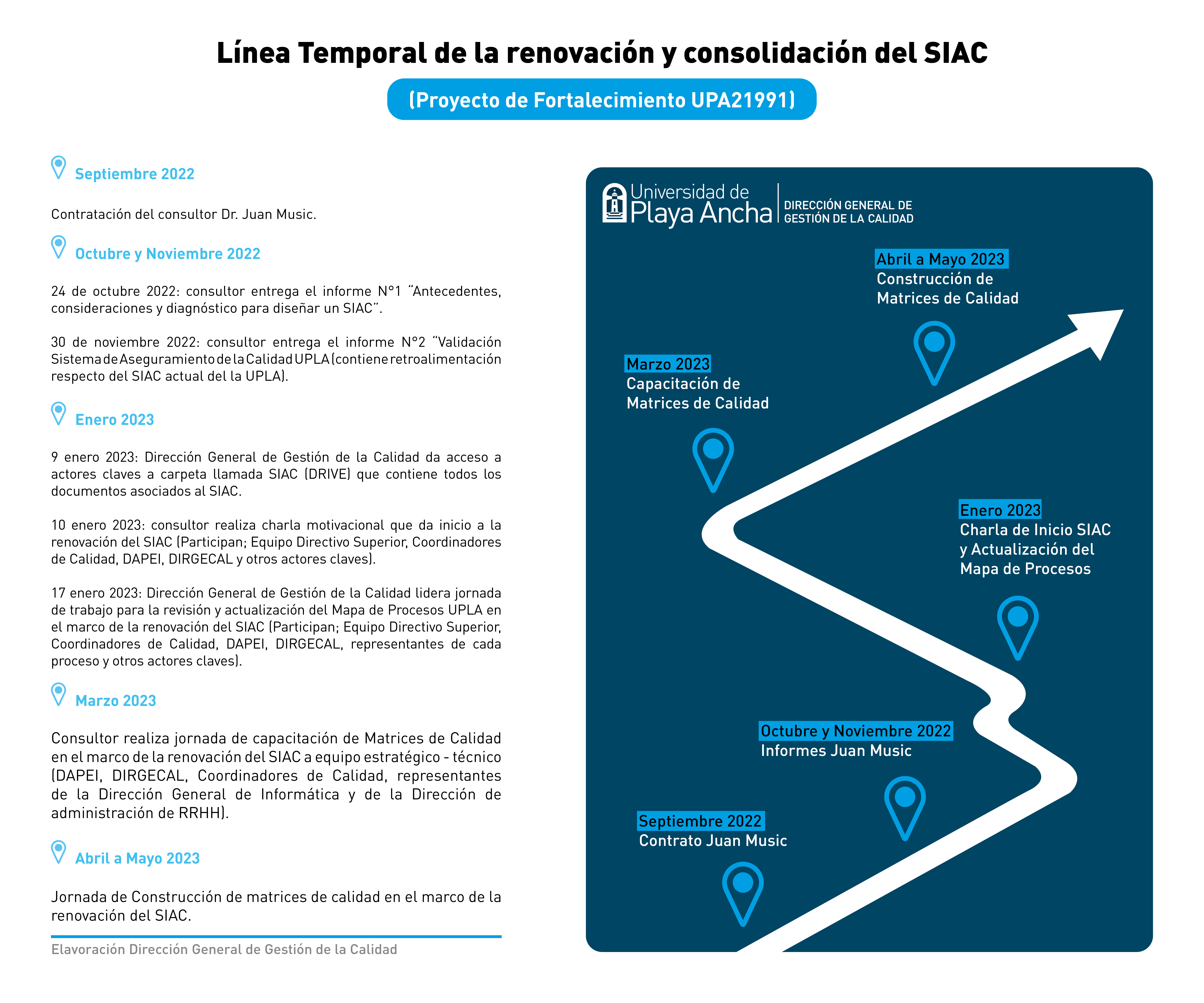 Esta actividad se contextualiza en la asesoría realizada en Enero del presente año, donde Music, ante Autoridades, Vicerrectores(as), Decanos(as), Directores(as) Generales y Funcionarios de la UPLA, abordó los detalles del nuevo Sistema de Acreditación de la Calidad Universitaria, que considera nuevos criterios y estándares (nuevas exigencias que surgen de la Ley de Educación Superior N° 21.091), así también, sobre los desafíos para la Universidad de Playa Ancha; y las bases conceptuales y organizacionales de un Sistema Interno de Aseguramiento de la Calidad.