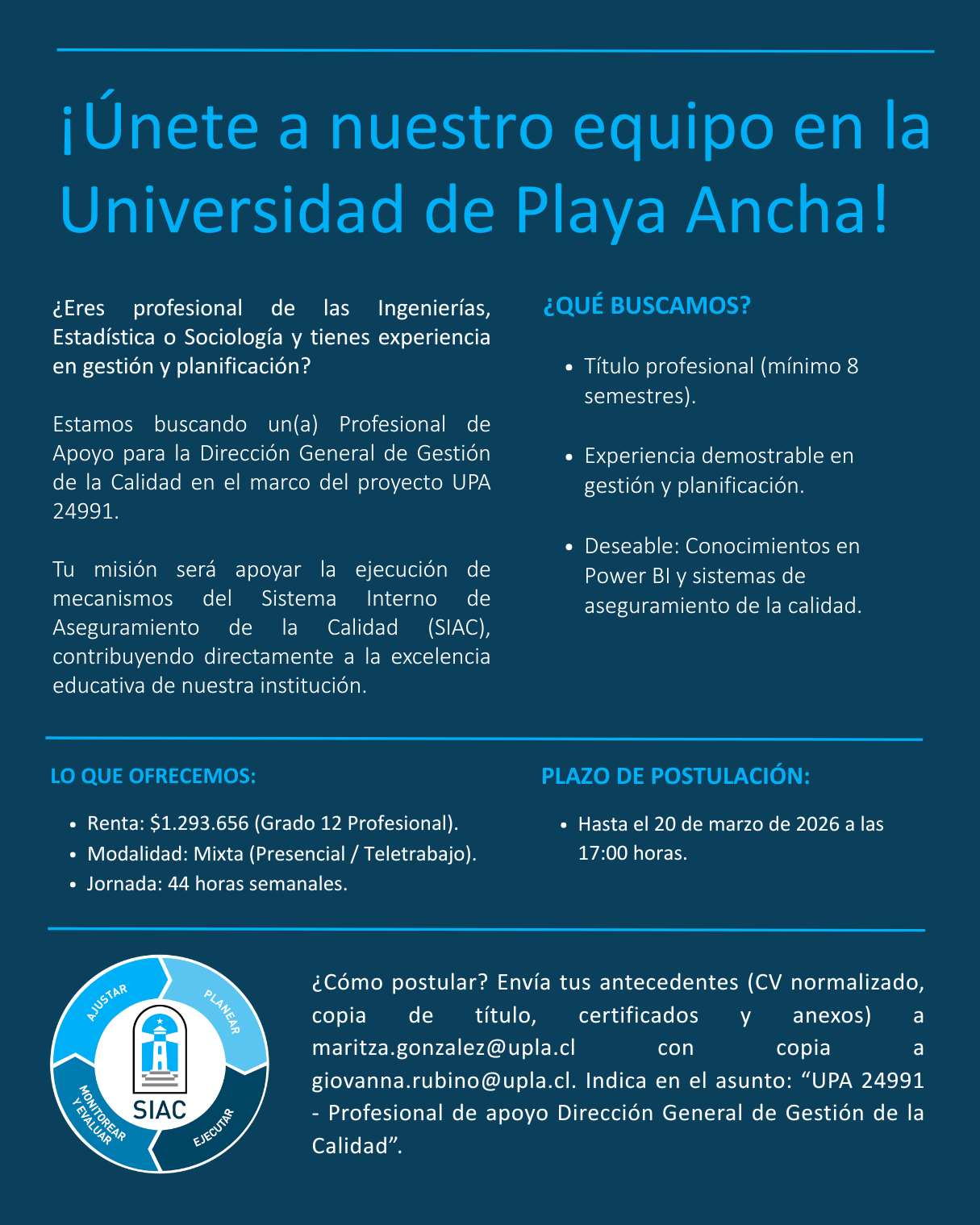 La Universidad de Playa Ancha, en el marco del Proyecto Fortalecimiento Institucional UPA 24991, «Hacia una educación de excelencia centrada en las y los estudiantes, a través del fortalecimiento de los procesos formativos, la promoción de la investigación, creación e innovación y la instalación de nuevos mecanismos de aseguramiento de la calidad», llama a concurso público con el fin de proveer los servicios de un o una Profesional de apoyo a la Dirección General de Gestión de la Calidad (Dirgecal).