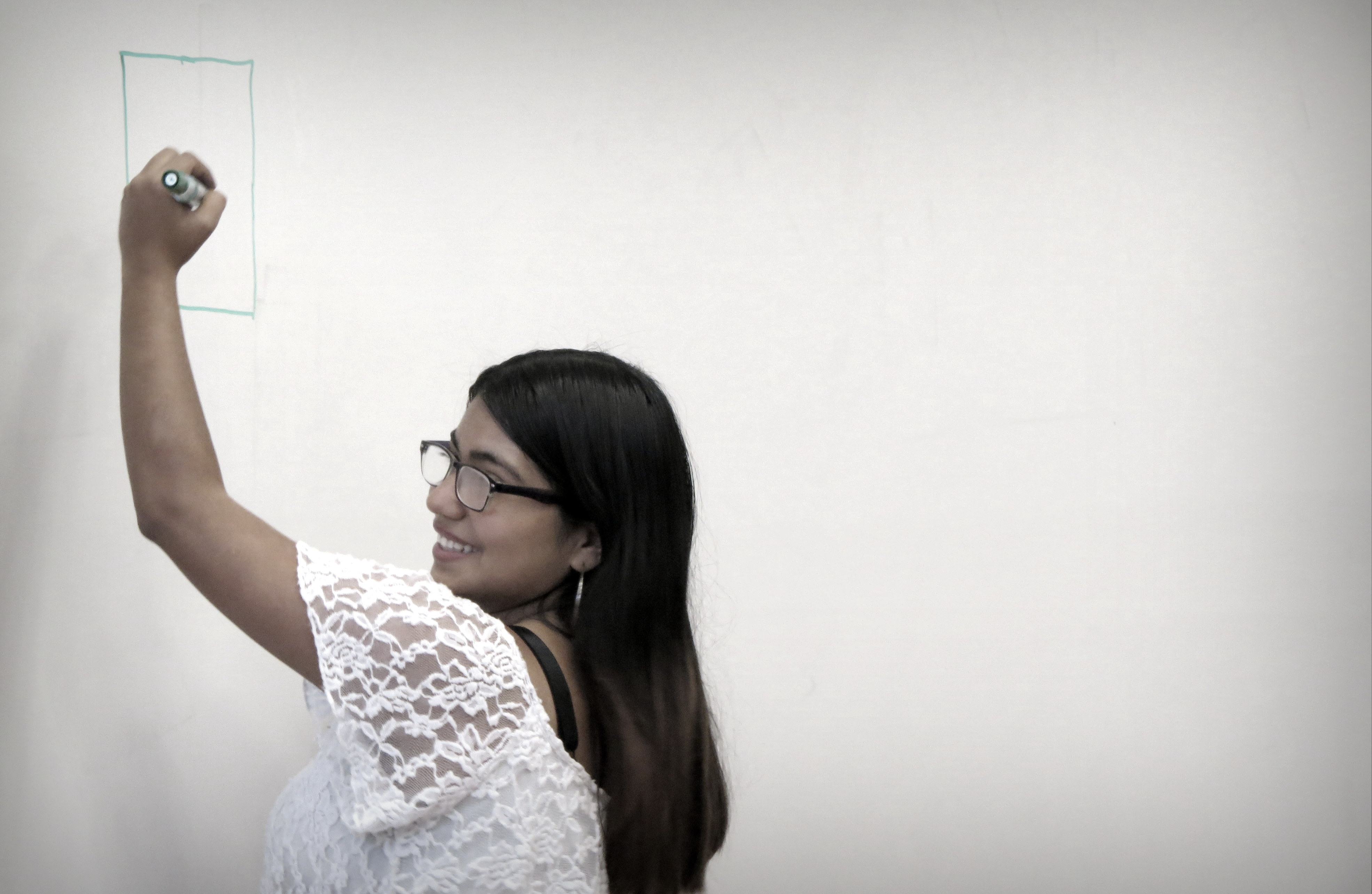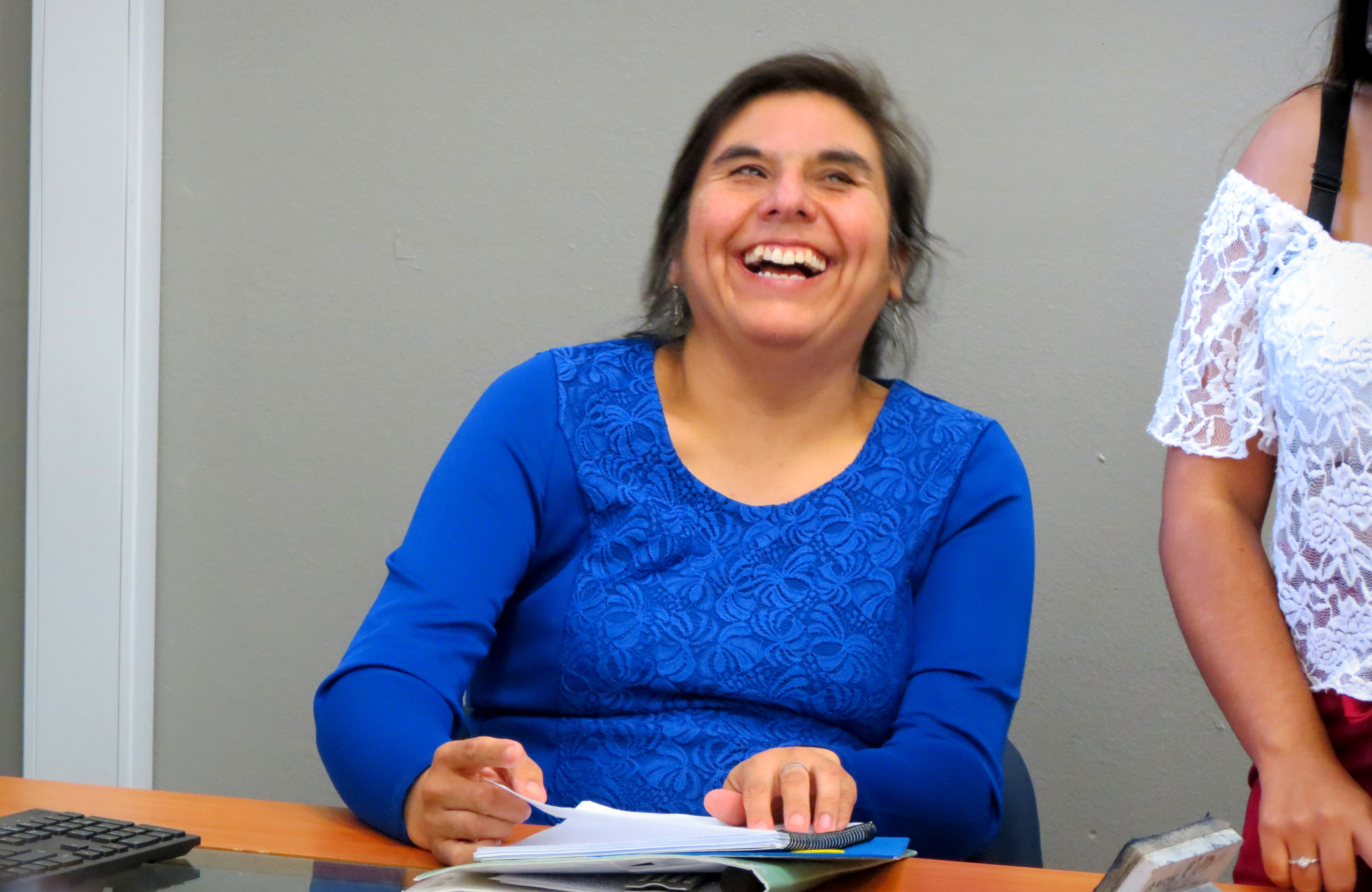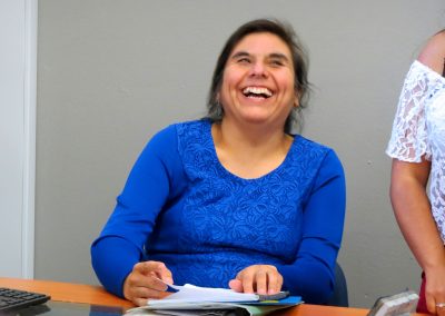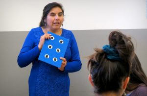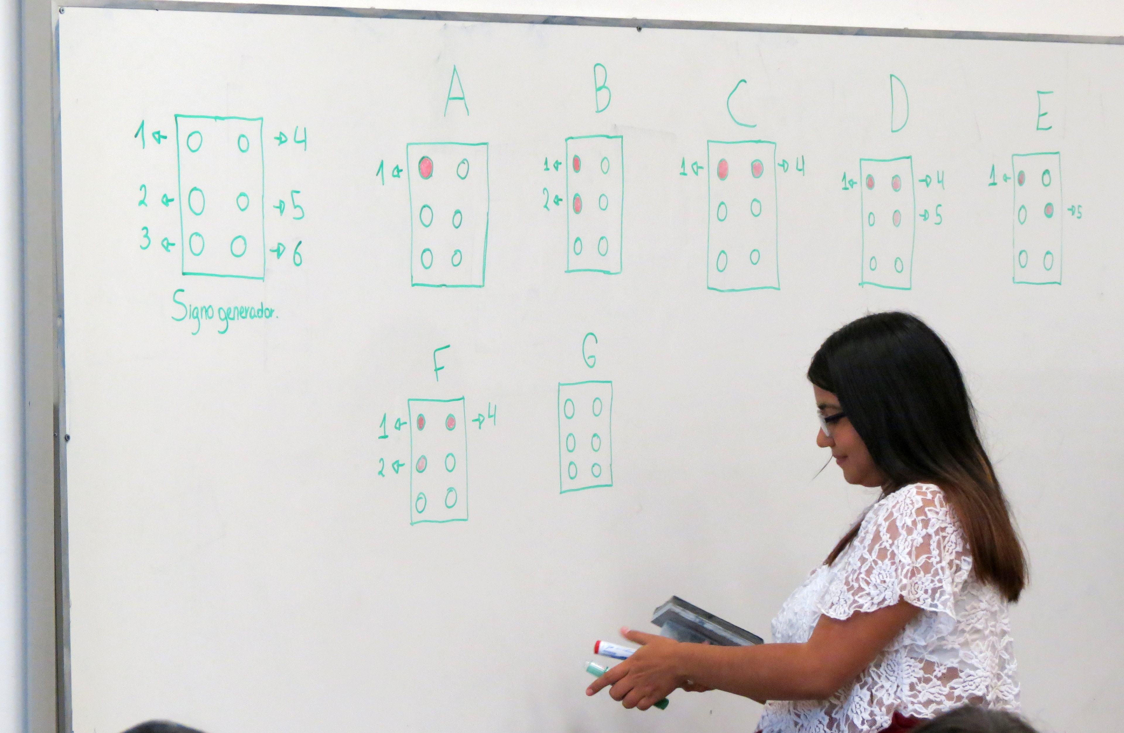En relación a lo que está siendo el Taller de Braille, Mariela Pérez, profesora de Educación Básica egresada de la UPLA, magíster en Educación Diferencial y ciega de nacimiento, es quien está a cargo de dictarlo. Esta instancia de capacitación se está abordando desde un método visual, donde se emplea un cajetín (que contiene los seis puntos en los que se mueve y escribe el braille) para enseñar el abecedario, los números, los signos y, posteriormente, a escribir.