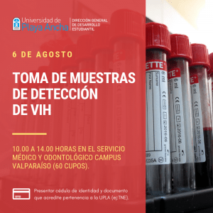 Este martes 6 de agosto, la Dirección General de Desarrollo Estudiantil de la Universidad de Playa Ancha realizó una nueva jornada de toma de muestras de detección de VIH, en la cual se otorgaron 60 cupos gratuitos para Test de Elisa a los alumnos de la UPLA y de las instituciones de Educación Superior del Consejo de Rectores de Valparaíso, es decir, la Pontificia Universidad Católica de Valparaíso, Universidad Técnica Federico Santa María y Universidad de Valparaíso.
