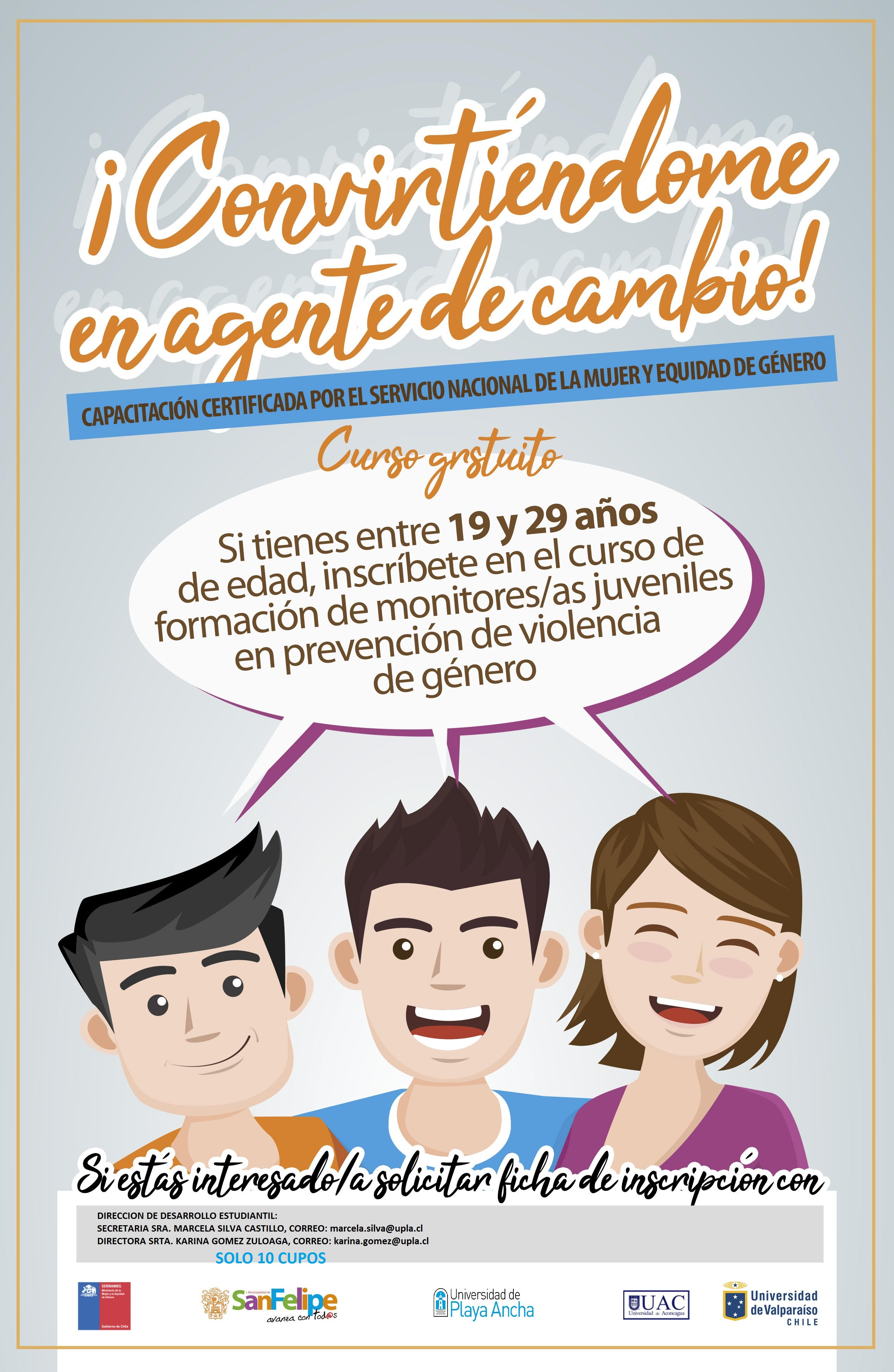 La Dirección de Desarrollo Estudiantil campus San Felipe los invita a participar en el Curso de Formación de Monitores en Prevención de Violencia de Género, el cual se realizará los días 19 y 26 de agosto y 2 y 23 de septiembre, a partir de las 17.00 horas en el campus Valparaíso, y será certificado por el Servicio Nacional de la Mujer y Equidad de Género (SERNAMEG). Son sólo 10 cupos.