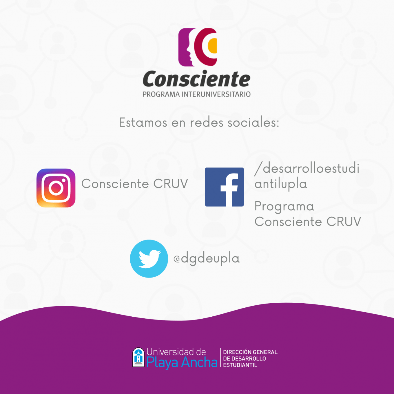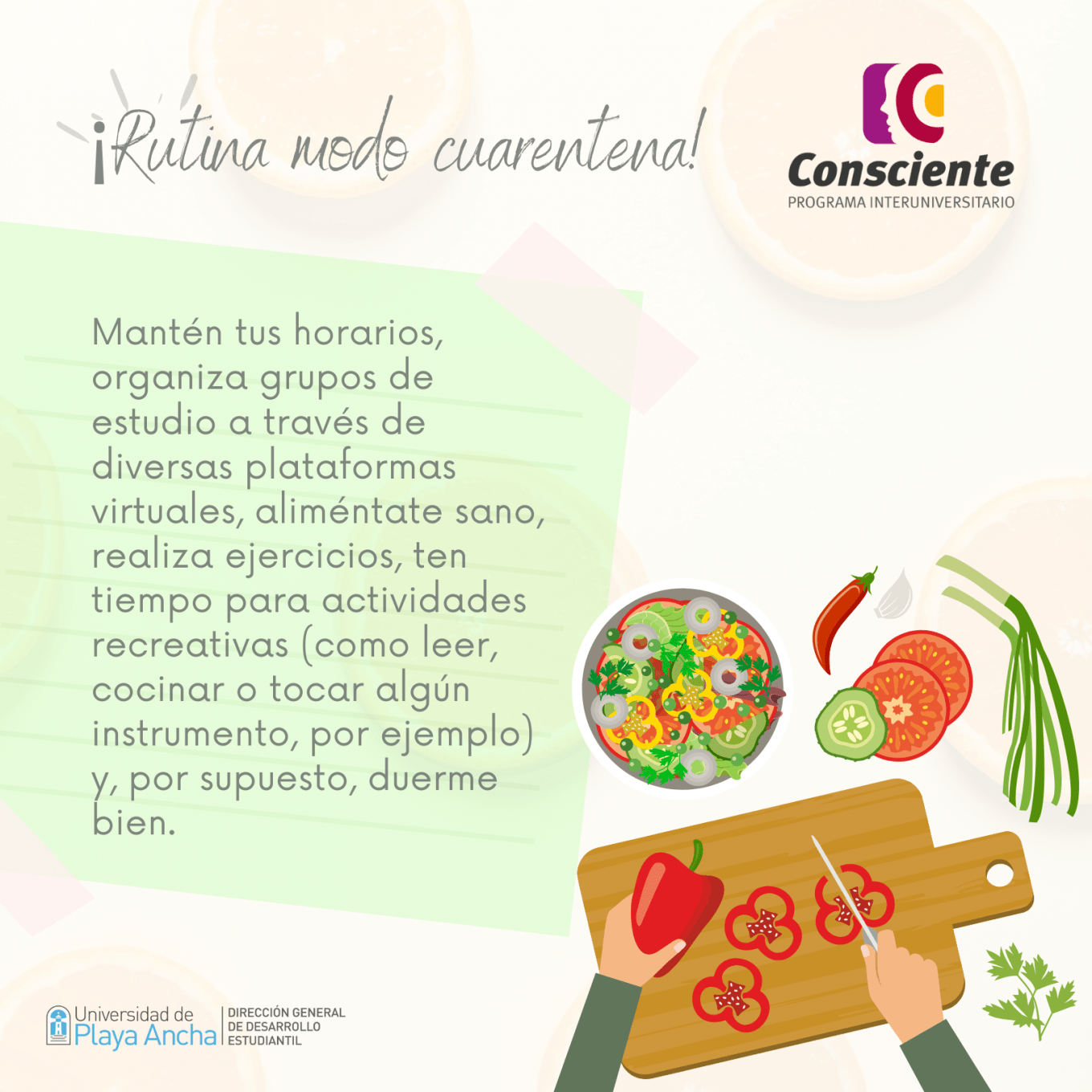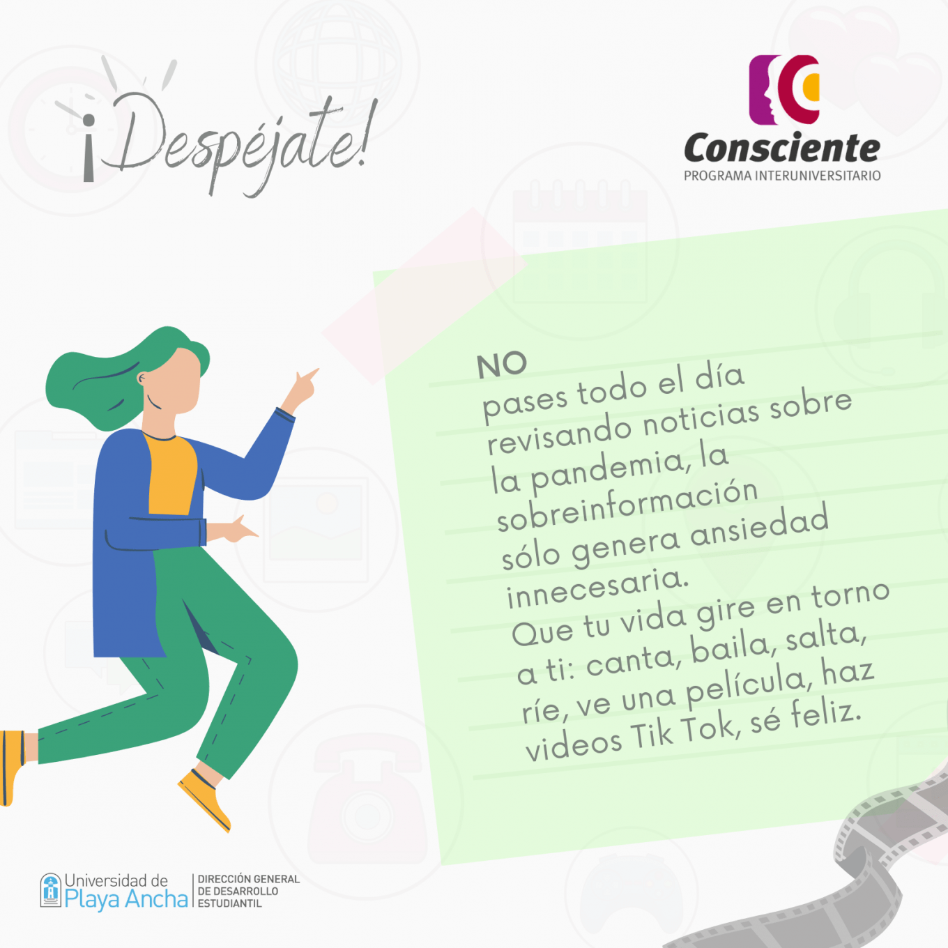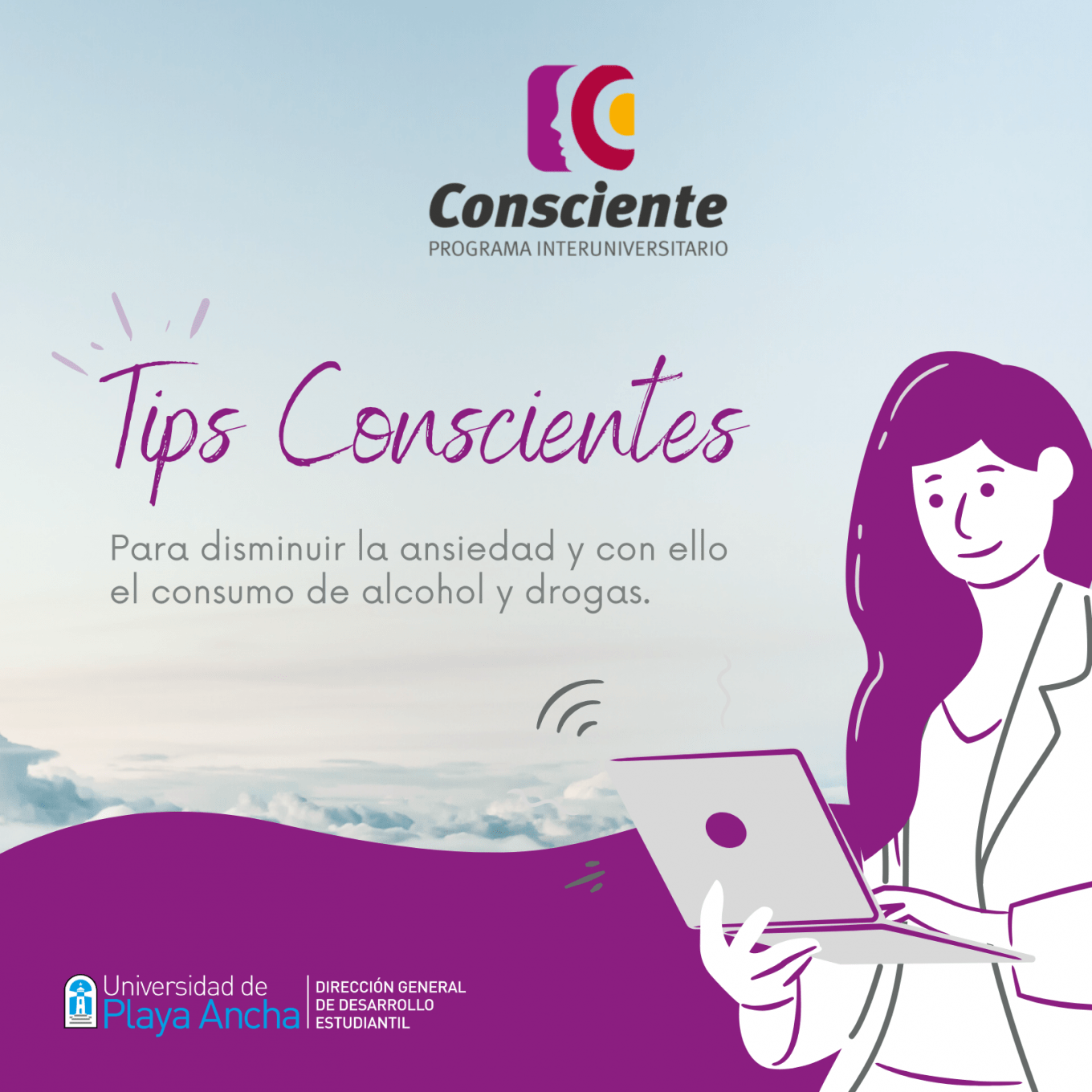 El Programa Interuniversitario Consciente (de prevención y gestión del riesgo del consumo de sustancias), en conjunto con la Dirección General de Desarrollo Estudiantil, te recuerdan que en esta pandemia no estás solo. Revisa nuestros «Tips Conscientes» para disminuir la ansiedad y, a la vez, el consumo de alcohol y drogas.