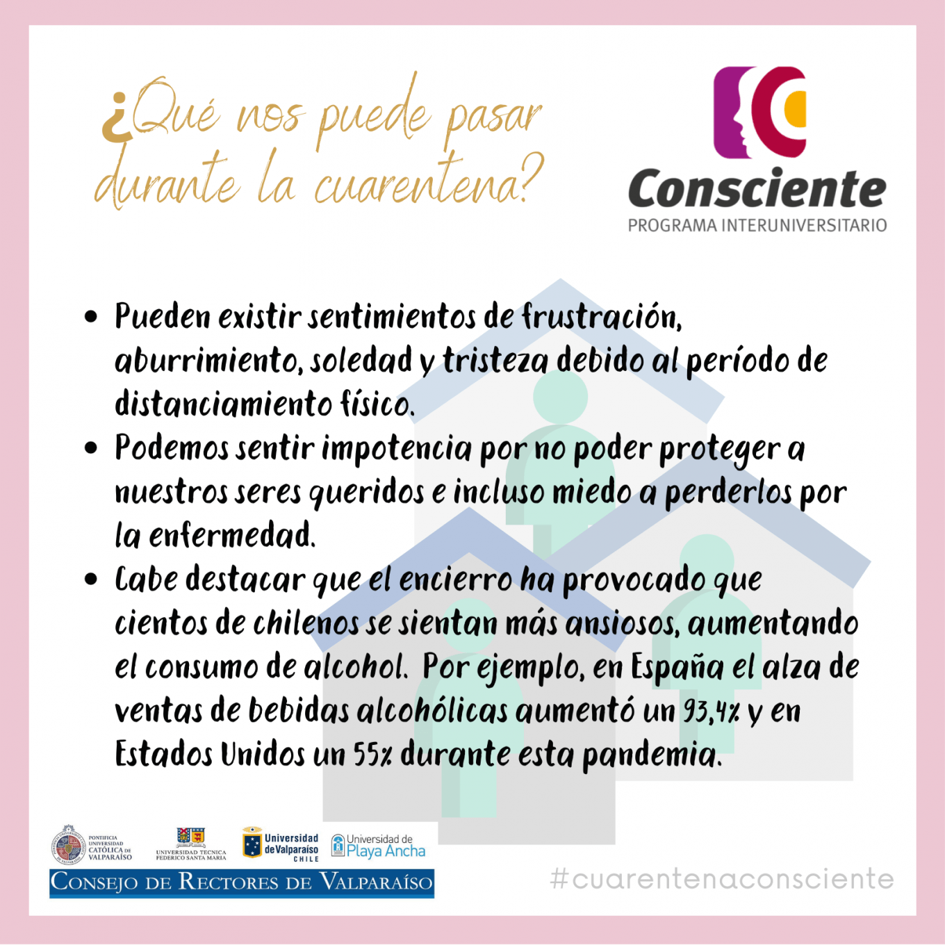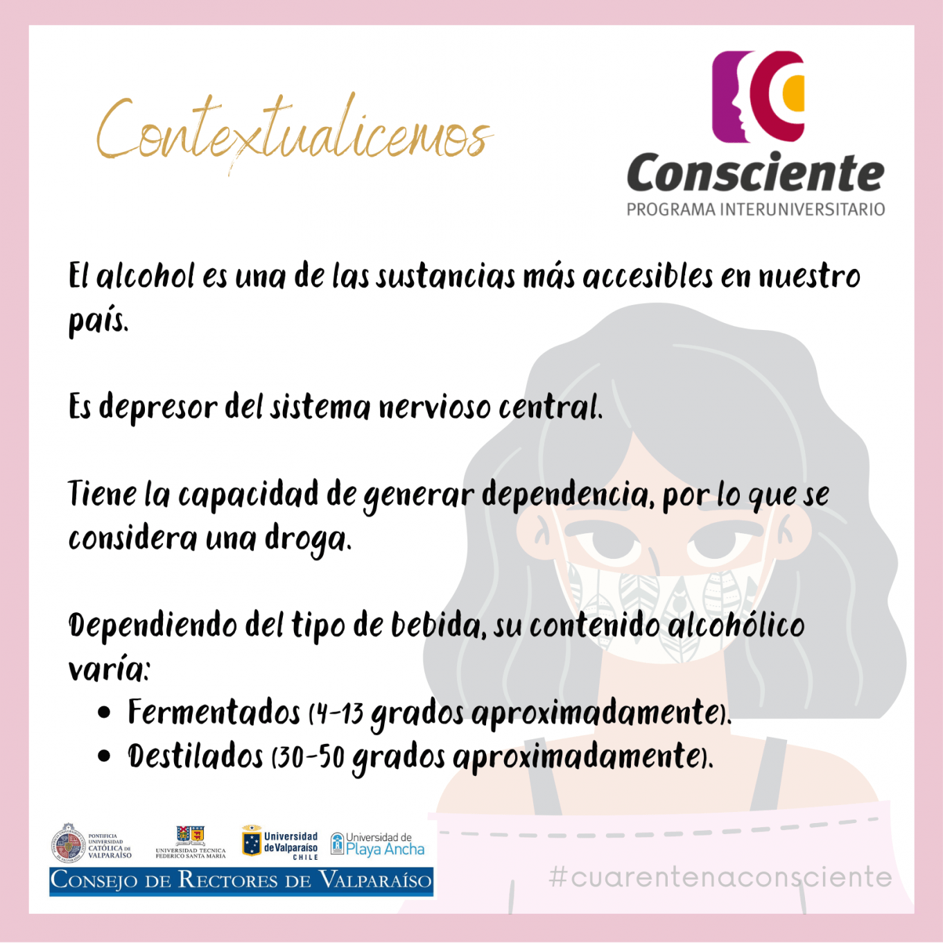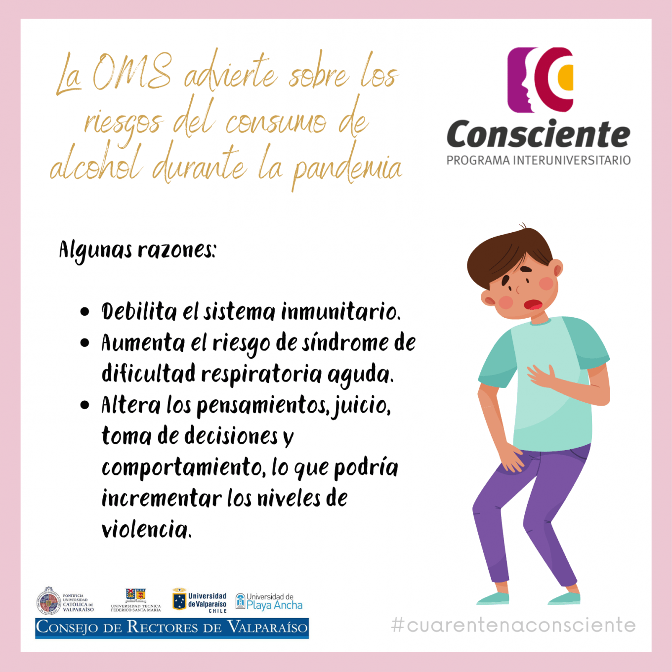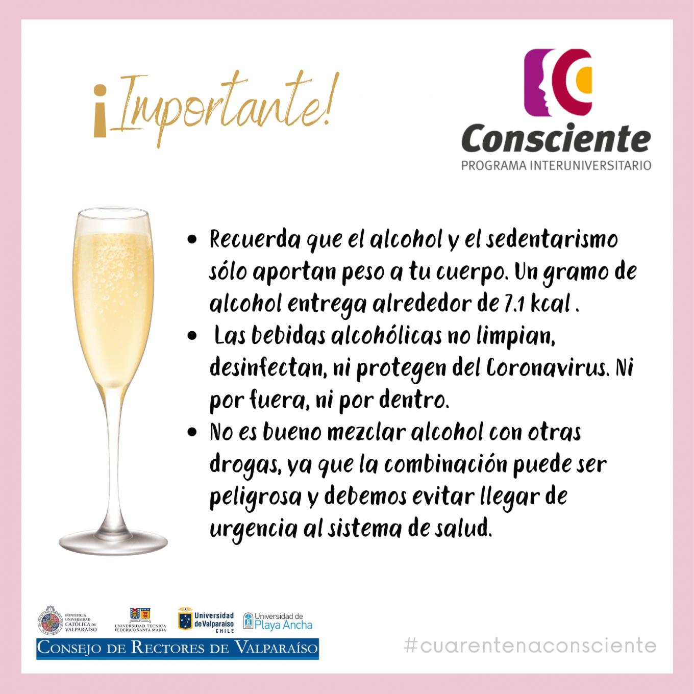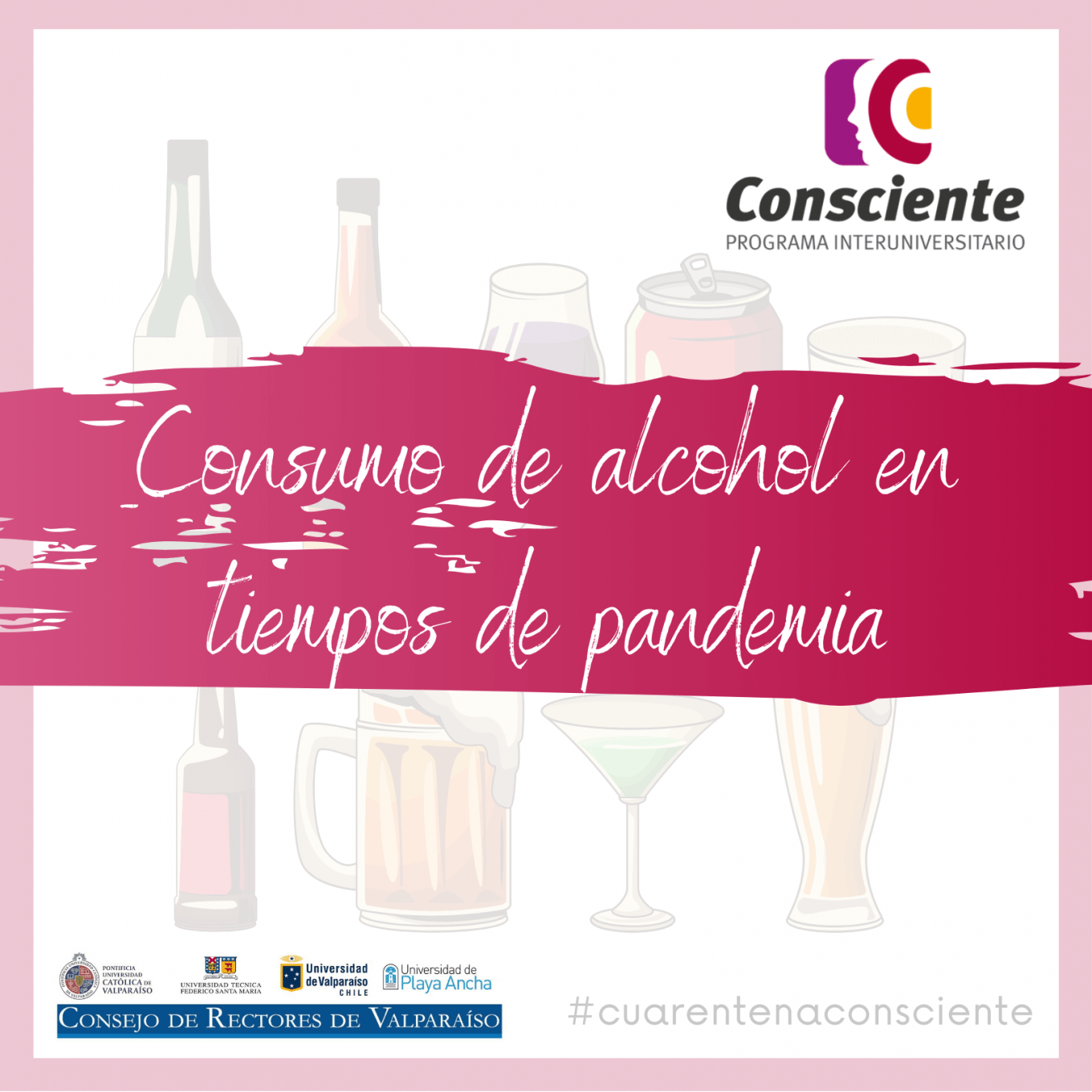 El Programa Interuniversitario Consciente, de prevención y gestión del riesgo del consumo de drogas, alcohol y otras sustancias, comparte nuevas piezas gráficas en relación a la ingesta de alcohol en esta pandemia, cuya información nos invita a reflexionar sobre cómo podría perjudicarnos a nosotros mismos y a nuestro entorno en esta cuarentena por Coronavirus COVID-19.